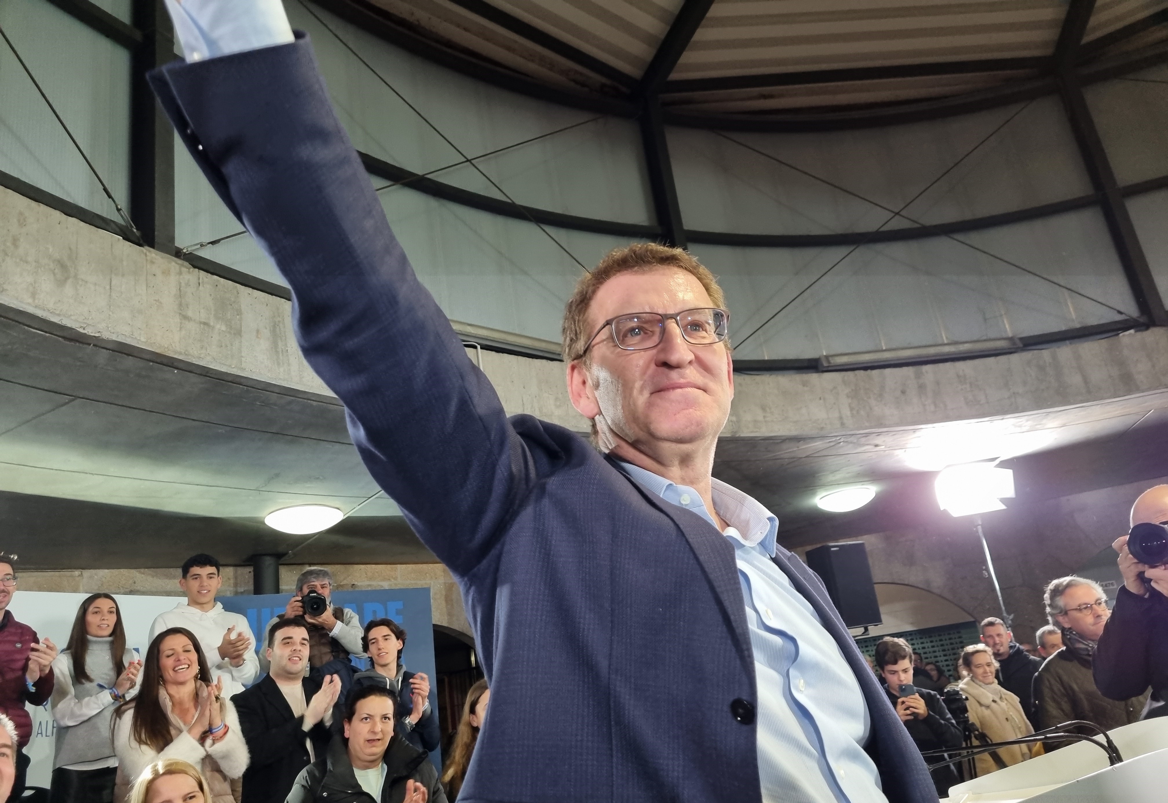 Abarrote total en el insuficiente recinto del multiusos del mercado para albergar el esperado mitin de Núñez Feijóo ayer en Marín con una nube de miembros de los medios de comunicación que buscaban, principalmente, las palabras del expresidente gallego sobre la polémica de sus anteriores palabras sobre amnistía e indultos