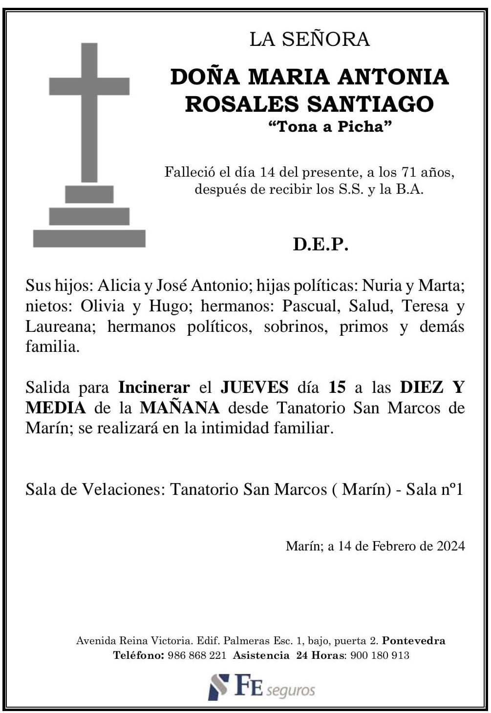 La Funeraria La Fe informa que, en la sala de velaciones número 1 del tanatorio San Marcos de Marín se encuentran los restos mortales de doña María Antonia Rosales Santiago, fallecida hoy miércoles día 14, hasta el momento de su traslado, mañana jueves día 15 a las 10,30 de la mañana para su incineración en la intimidad familiar. D.E.P.