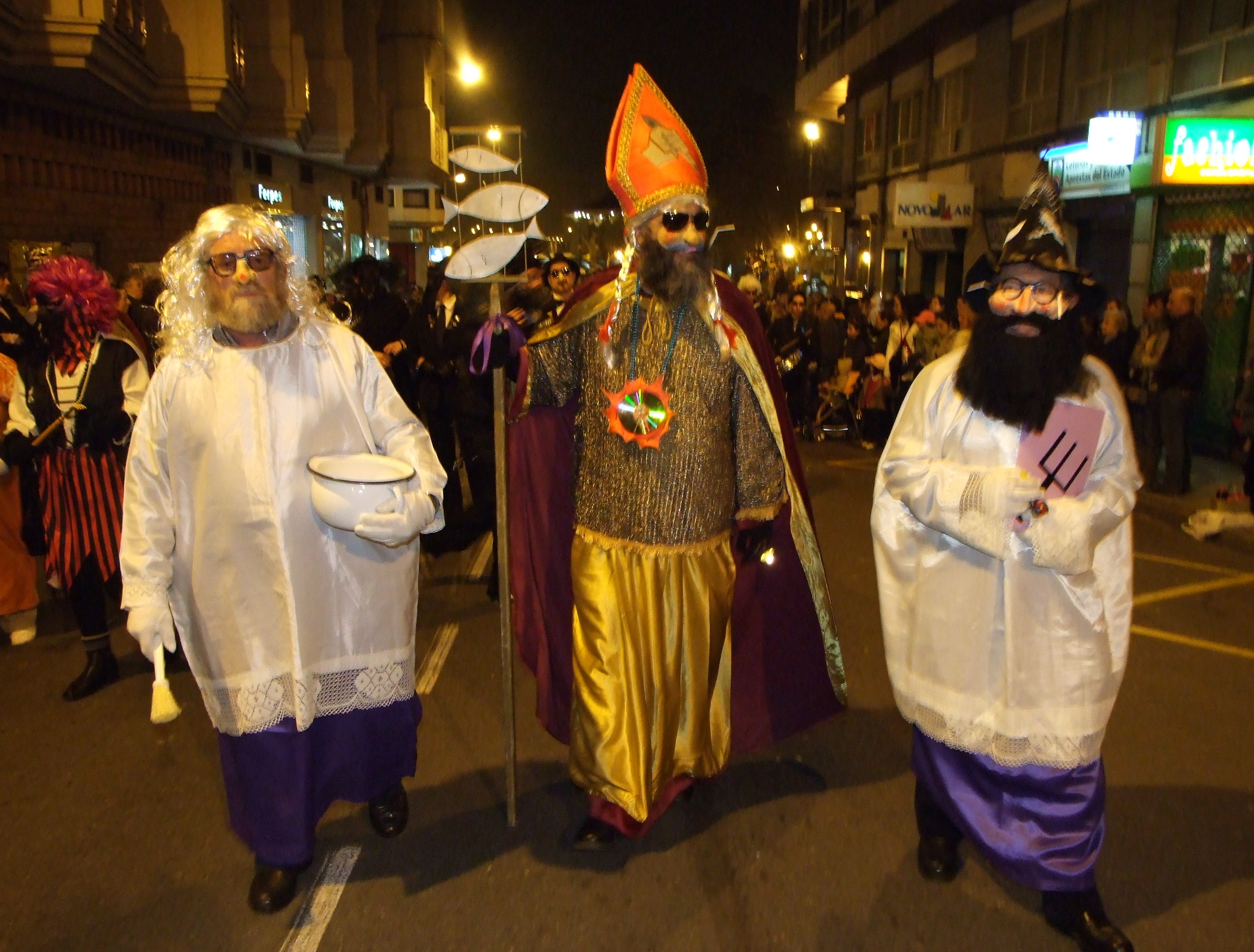 Detrás, aparecen estrafalarias autoridades civiles, militares y religiosas. Un grupo esperpéntico y desenfadado; pero ataviados con todo lujo de detalles ocurrentes y extravagantes. La música acompaña al cortejo y al concurrido número de viudas, viudos, solteras, solteronas y algún que otro personaje despistado, incluido en el desfile. Llegaron a una esplanada, en donde las autoridades fueron ocupando sus puestos en un palco allí instalado para la ocasión. Durante todo el trayecto se oía por la megafonía las oportunas explicaciones dadas por el maestro de ceremonias desde el propio palco. Se respiraba, además, un insoportable humo, provocado por el fuego de cuerdas, brea y cuantos elementos inflamables e insoportables se quemaban en unos bidones metálicos dispuestos para la ocasión. Una vez en el palco, el mismo cura antenado con las pajitas y provisto del cuadro con la parrilla invertida; soltó un discurso jocoso, ceremonioso, ocurrente y con su pizca sátira y picante. Una vez concluido, el obispo revestido de manera ostentosa, con su punto de elegancia, estrafalaria y esperpéntica leyó la centenaria LADAÍÑA DA SARDIÑA. Obra escrita por uno de los personajes de la villa para despedir el Entierro de la Sardina que, en boca del obispo sermoneaba, regalando con su voz a los presentes y oyentes en la alameda: las esencias marinas de la villa; el barroquismo galaico convertido en jacarandosos rezos burlones y populares. Un escenario impresionante, desconcertante, original ,sentido y compartido por un pueblo que participa activamente. Pocas veces se contemplan escenas de esta índole, en las que se implican todos los sentidos (aquel tufo, con aquel humo que despedía cuanto ardía en el caldero, se metía por nariz y garganta, provocando la inevitable tos). La música, los colores, la puesta en escena de los distintos personajes, las quejas insufribles de las desconsoladas viudas. O, la improvisación y ocurrencias de quienes se cuelan de rondón en el cortejo. Una vez acabado el sermón, se entierra (se tira) la sardina al mar de donde procede y vuelve. Y, como por arte de encantamiento, la tristeza, la música fúnebre, las lamentaciones se transforma en desenfreno, algarabía e irreprimible alegría festiva: el muerto al hoyo, y el vivo al bollo.