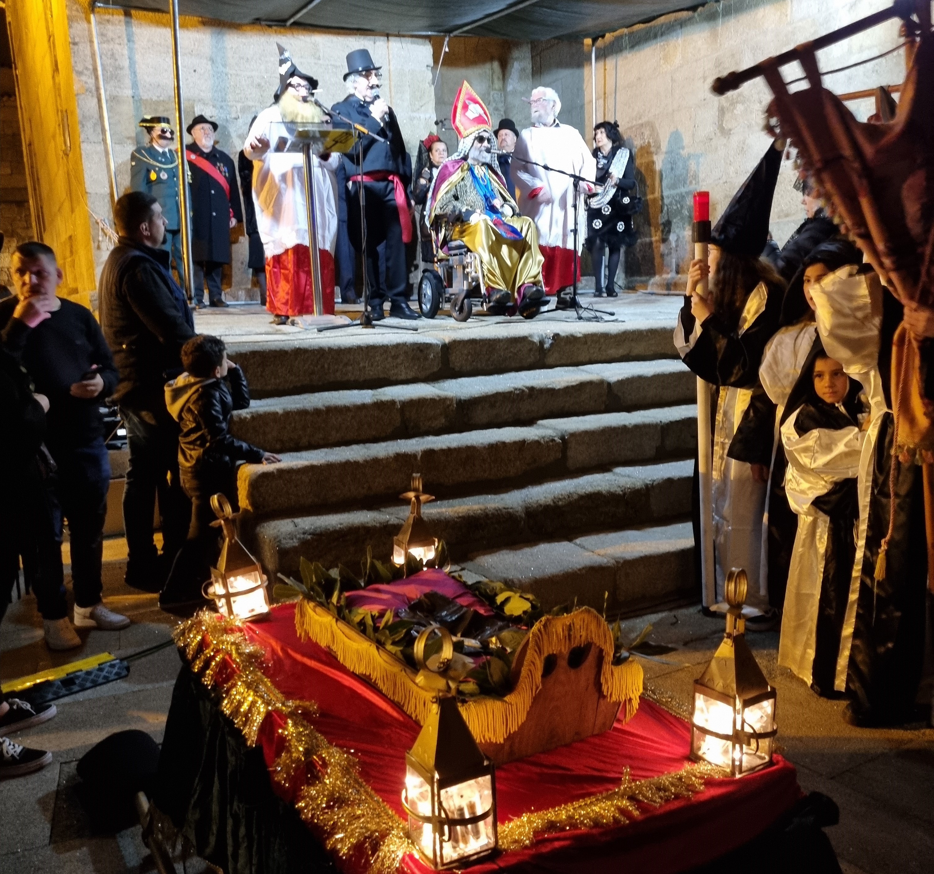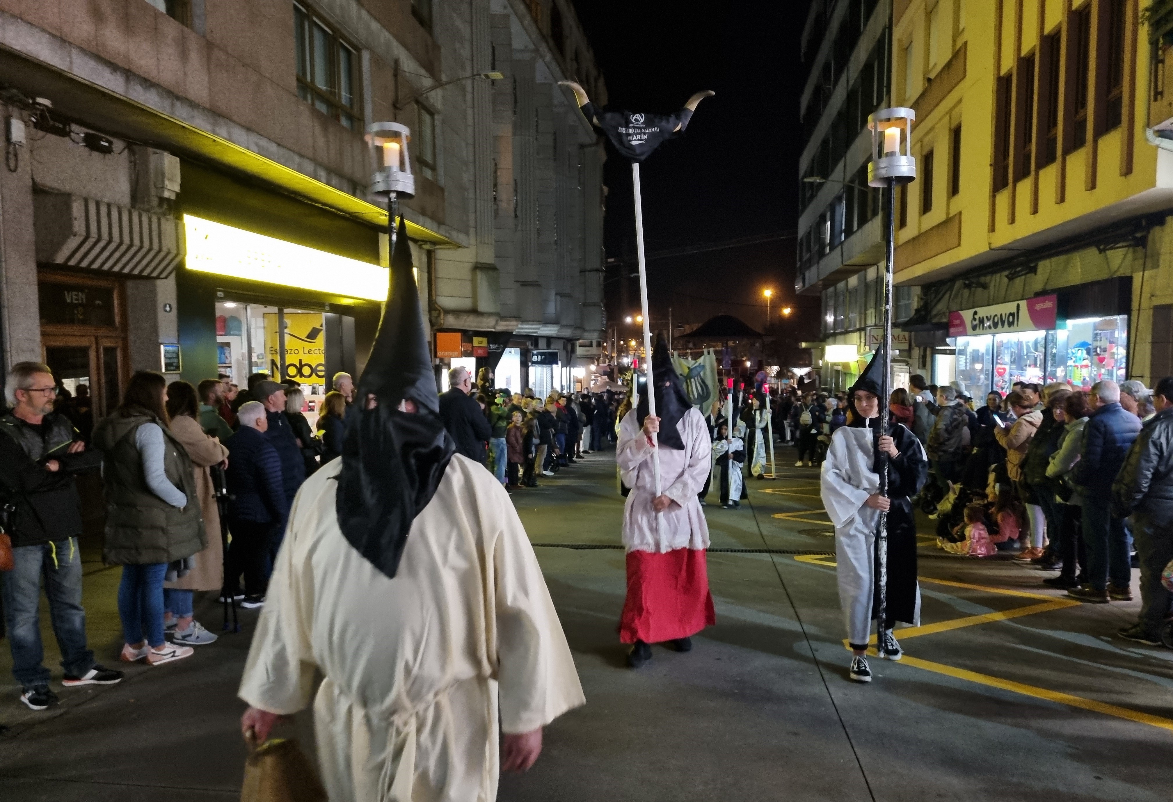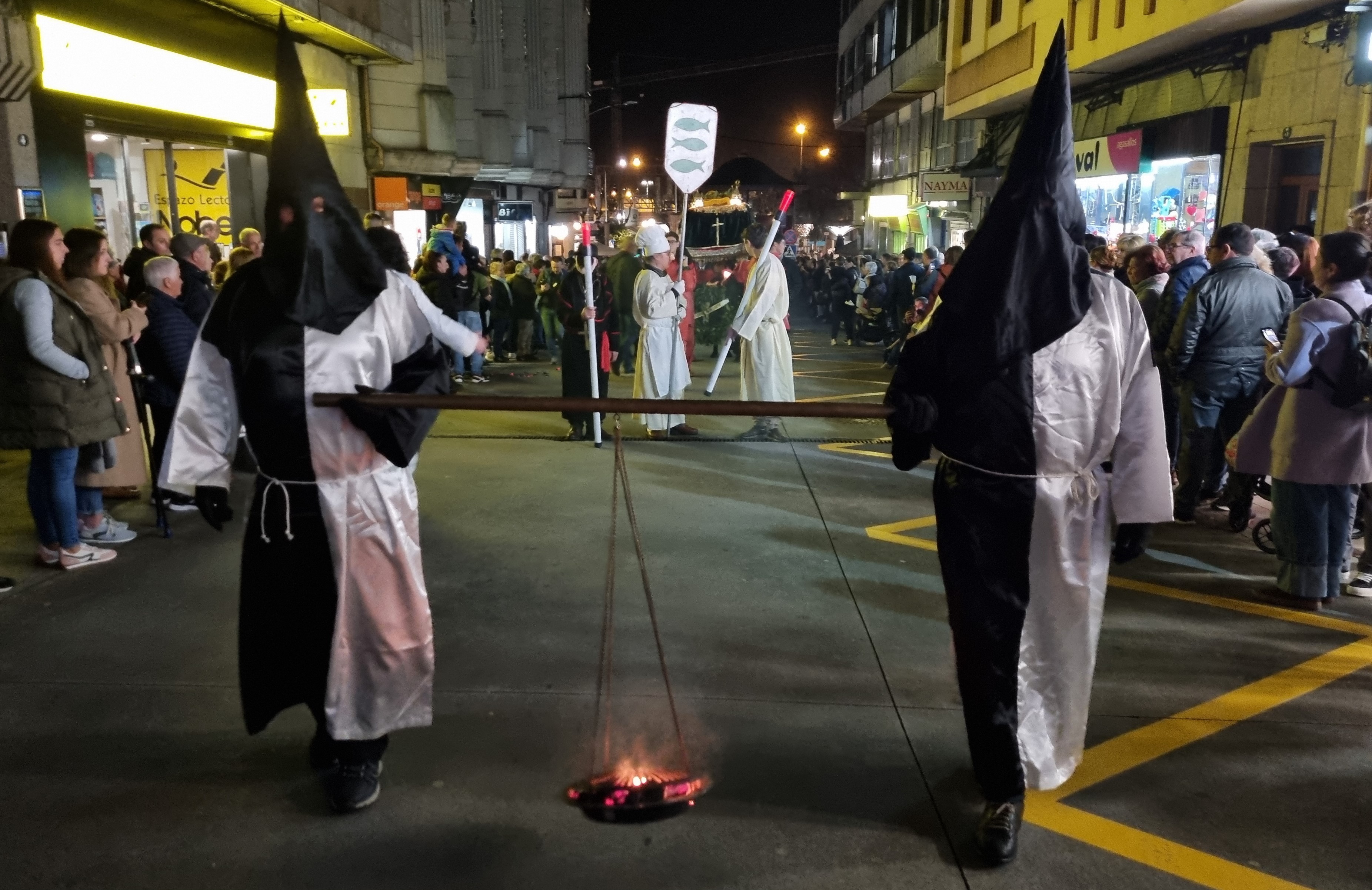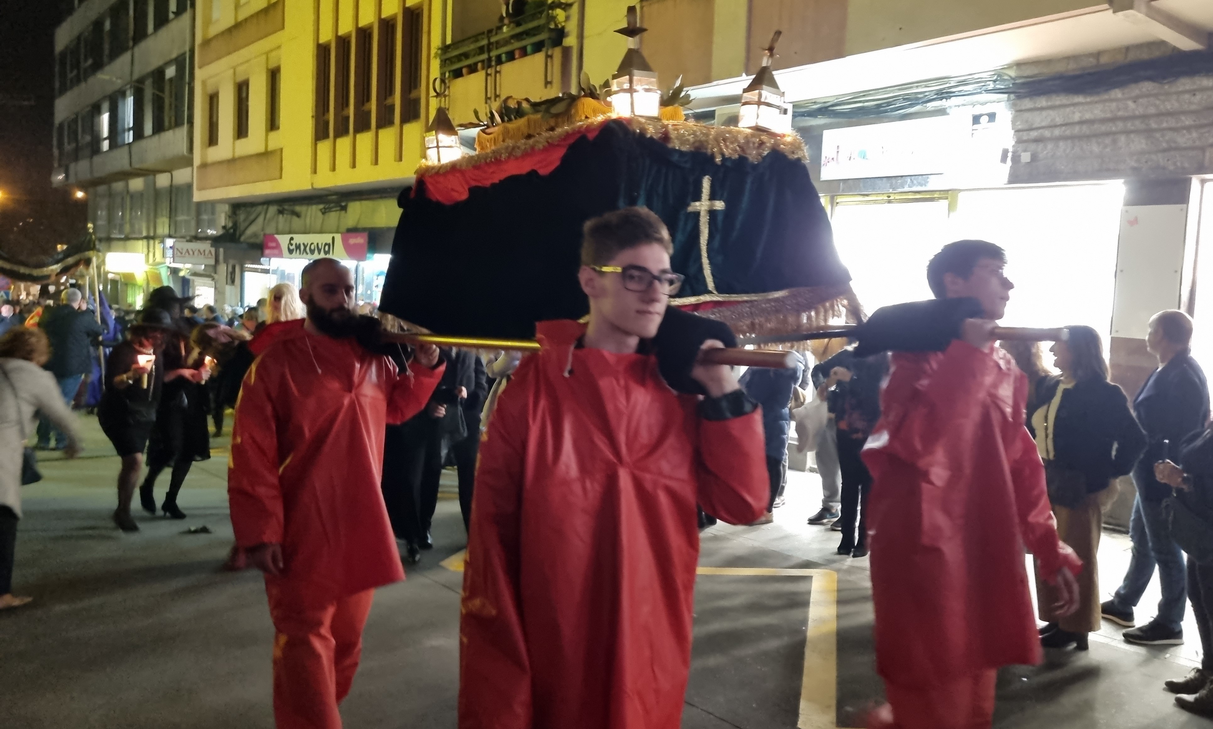 Y a las ocho en punto, partió la comitiva precedida por los cuernos, los estandartes y el ardiente azufre, a los sones de la banda do Enterro con ssu director “Boneti” al frente, domando el rumbo Jaime Janer arriba para retornar por Doctor Touriño y llegar a la Plaza del Reloj donde se encontraba instalado el recinto del sermón pronunciado por el “frade maior” y la letanía y sus bendiciones, por el “Bispo” que inició la retahíla con lo de “un ollón...dous ollóns...tres...y así hasta cinco (que por aquí suena “sinco”) con respuesta de los cientos de personas que presenciaban el acto, para seguir con la “ladaíña”, cuya composión es centenaria, invocando a cuanto peixe, bueno o malo hay en el mar.