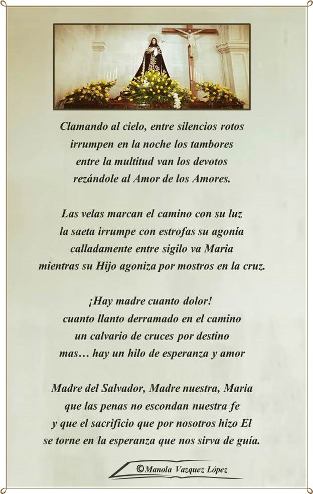 La poetisa marinense Manola Vázquez, habitual colaboradora de Carriola de Marín con la aportación de sus poemas, nos remite hoy, día de Jueves Santo, una de las fechas que remueven más las conciencias a la gente de bien, uno que dedica a la Virgen Dolorosa que aquí dejamos plasmado con especial gratitud.
