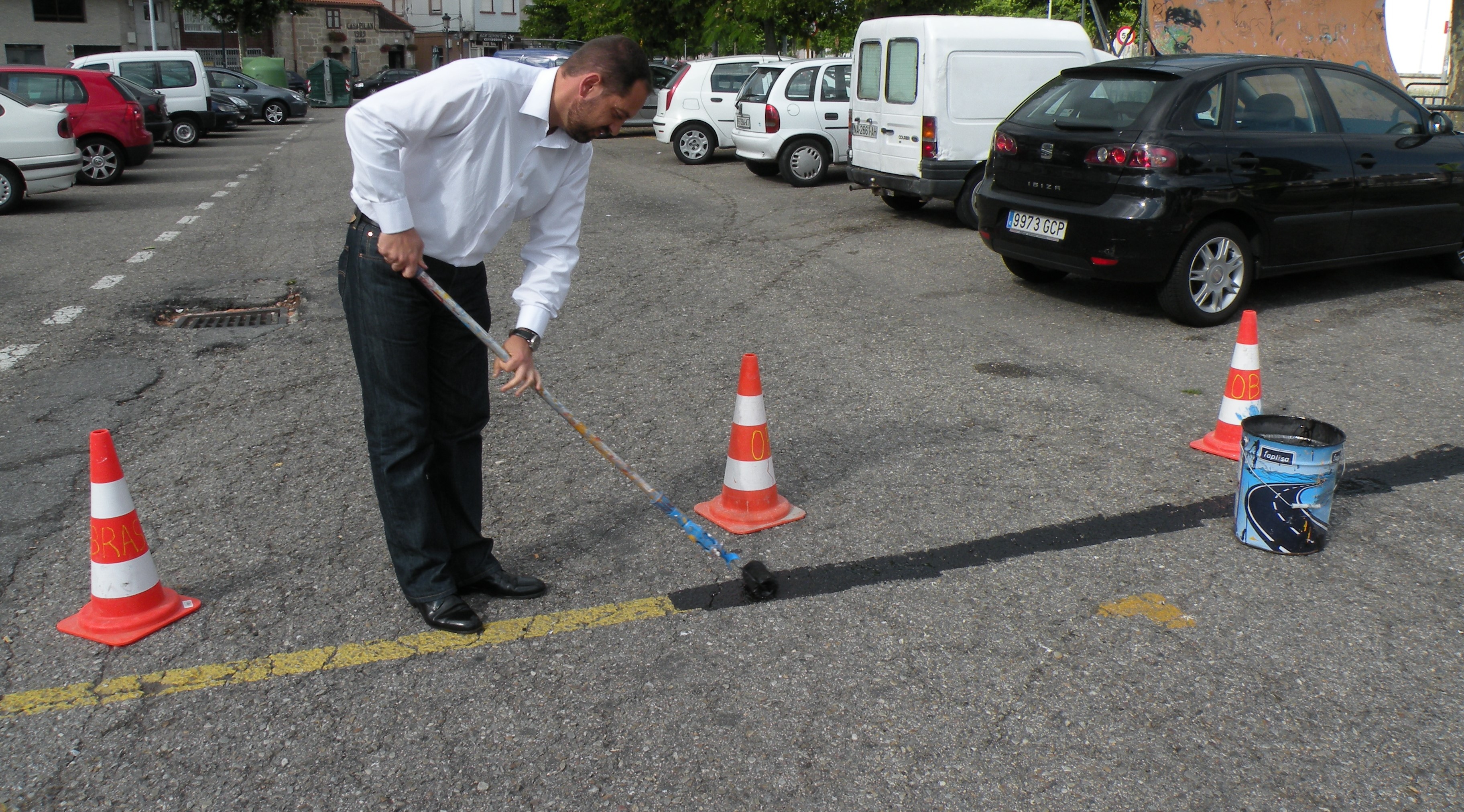 El alcalde socialista Fran Veiga borrando la línea divisoria que pintaron los pontevedreses
