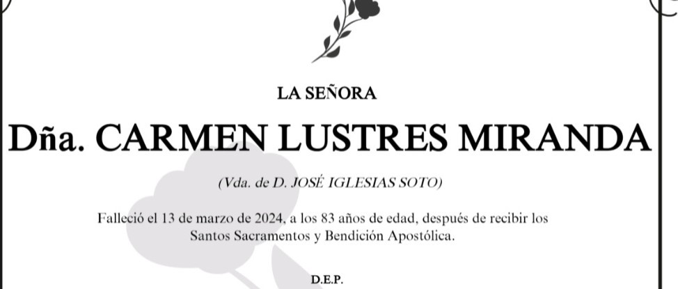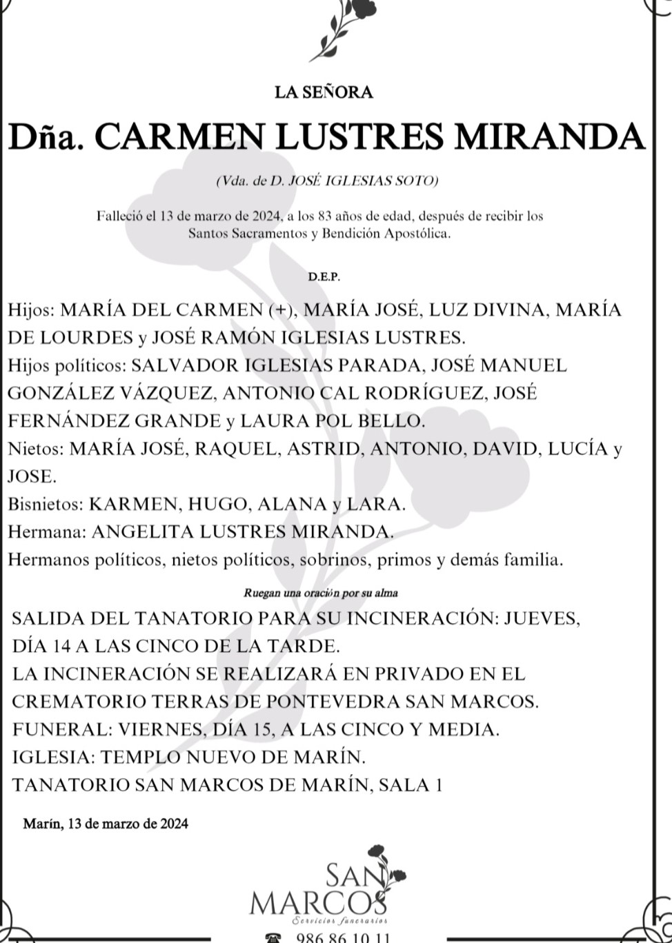 La Funeraria San Marcos informa que, en la sala de velaciones número 1 de su tanatorio de Marín se encuentran los restos mortales de Dña. Carmen Lustres Miranda, fallecida hoy día 13 de marzo, hasta el momento de su traslado, el jueves día 14 a las cinco de la tarde, para su incineración, en la intimidad familiar, en el crematorio Terras de Pontevedra.