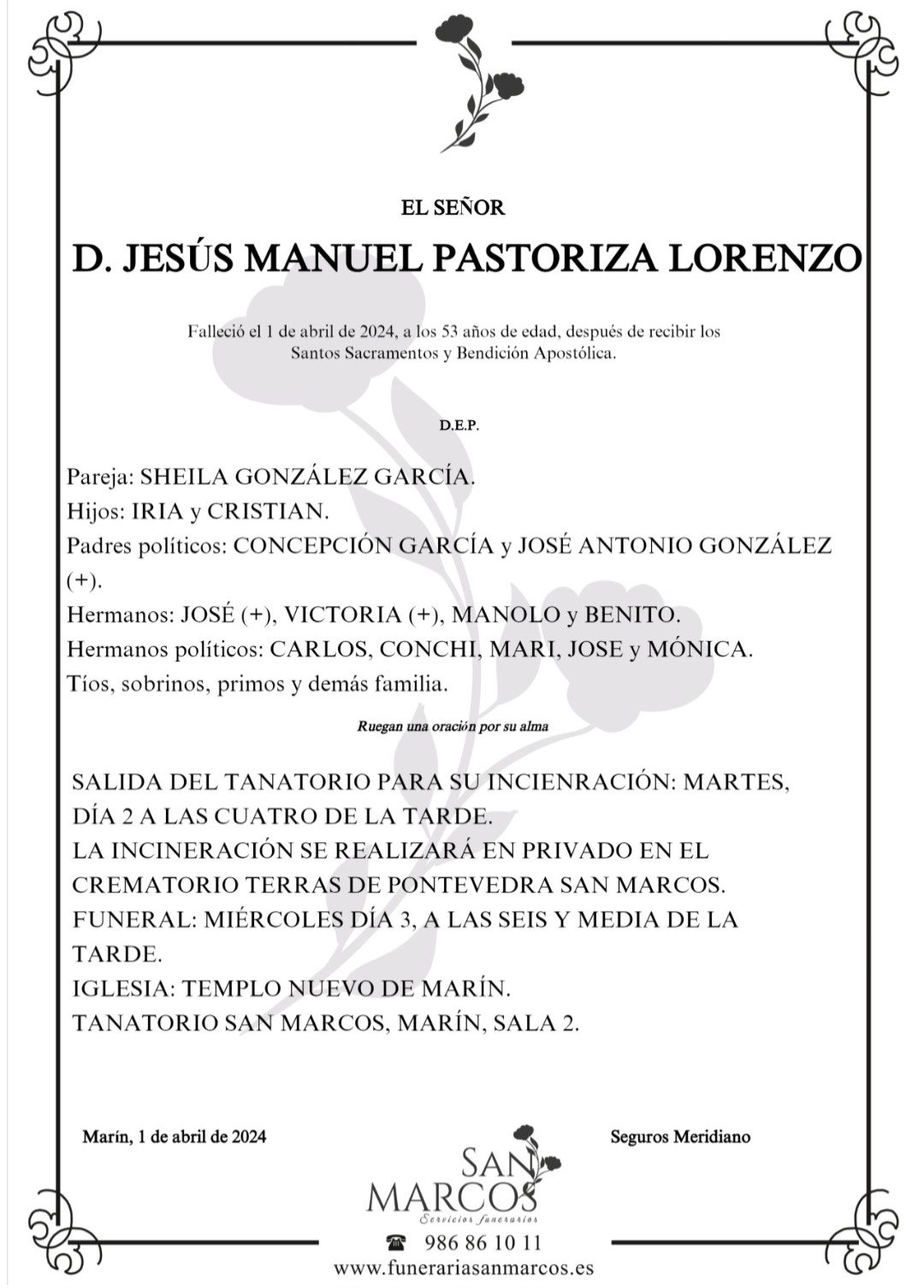 La Funeraria San Marcos informa que, en la sala de velaciones número 2 de su tanatorio de Marín se encuentran los restos mortales de D. Jesús Manuel Pastoriza Lorenzo, fallecido hoy día 1 de abril, hasta el momento de su traslado, mañana martes día 2 de abril a las cuatro de la tarde, desde el tanatorio al crematorio Terras de Pontevedra para su incineración que se realizará en privado
