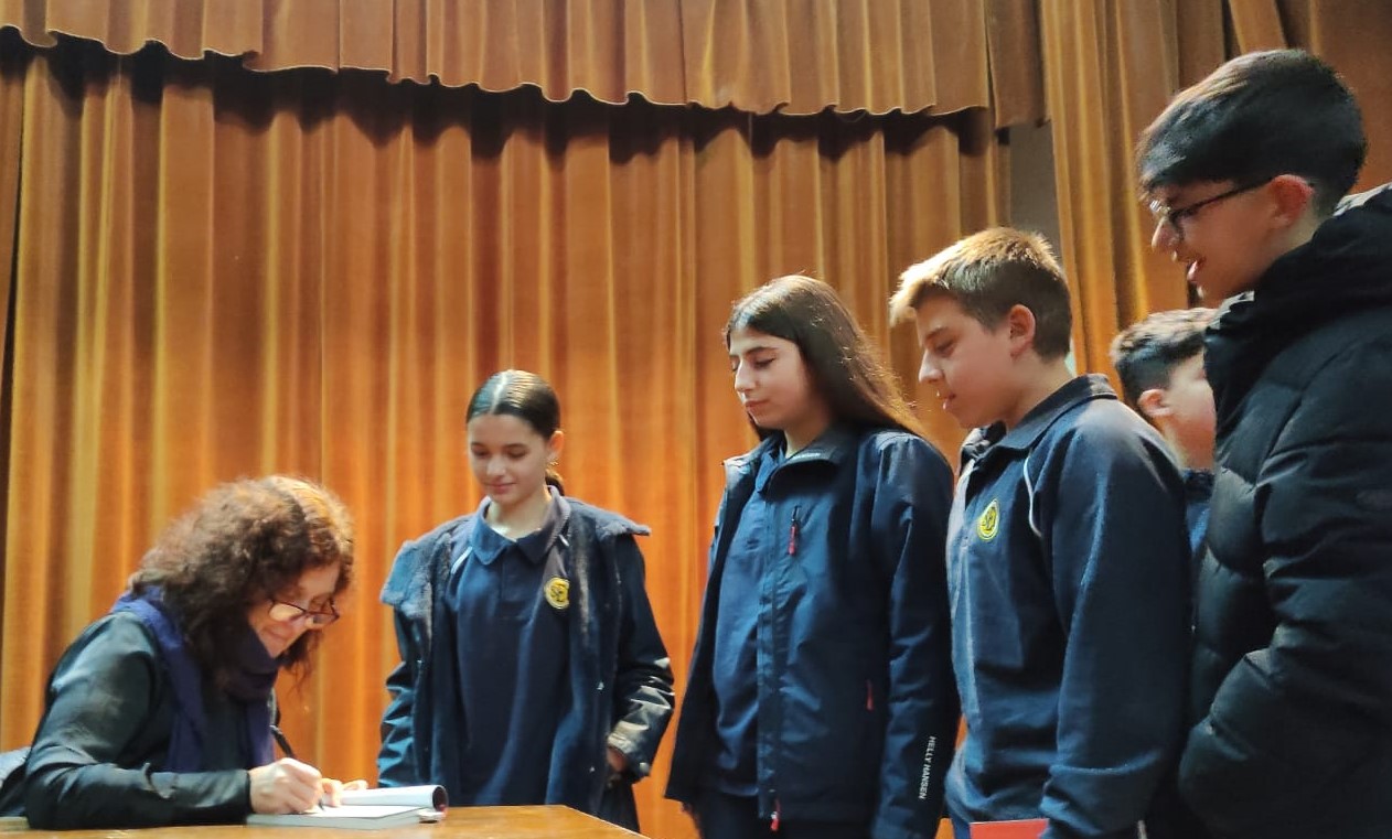 A escritora co a dirección e profesorado do centro