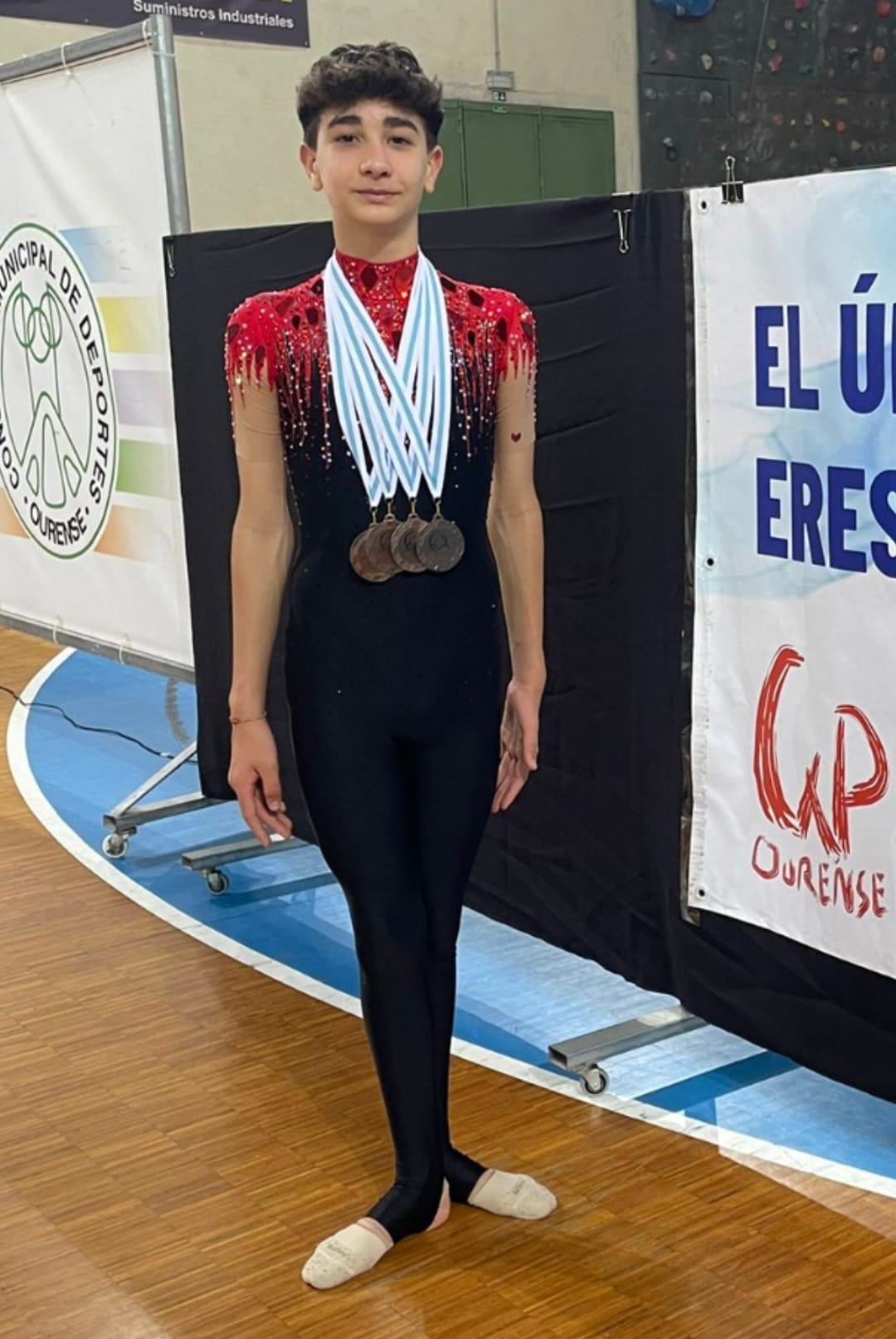 Alex Pazó Castro, un habitual en los cuadros de trofeos, consiguió esa vez en el campeonato gallego celebrado en Ourense, nada menos que tres medallas de bronce en las especialidades de “aro”, “mazas” y “cinta” lo que le valió para obtener también el tercer puesto gallego en la clasificación general con lo que se le abre la puerta a participar en el Campeonato de España que, a finales del próximo mes, se celebrará en Avilés.