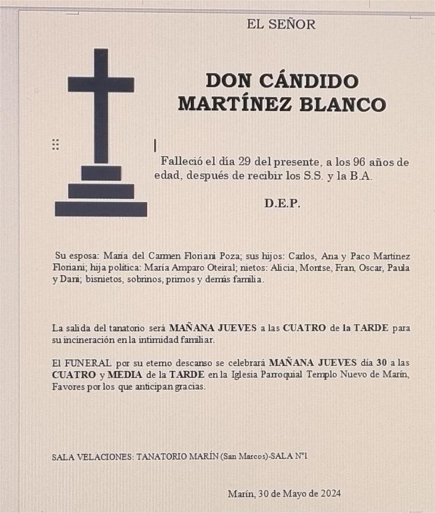La funeraria LA FE comunica que en la sala 1 del tanatorio San Marcos en Marín se velan los restos mortales de Don Cándido Martínez Blanco, fallecido hoy día 29, hasta el momento de su traslado para su incineración en la intimidad familiar, que se efectuará mañana jueves día 30 a las CUATRO de la tarde.