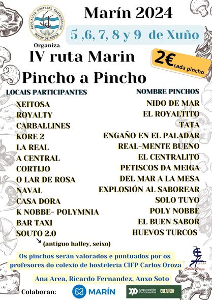 Según indicaron en el acto , “A ruta gastronómica, irá acompañada con múltiples actuacións musicais e pinchos de todo tipo cun prezo de 2 euros, os cales estarán disponibles nos bares participantes de 12.30 a 15.30 horas e 19.30 a 22.30 horas e haberá unha entrega de premios cara o mellor pincho da hostalaría marinense baixo o xuizo do profesorado do CIFP Carlos Oroza, Ana Area, Ricardo Fernández e Anxo Soto con catro premios a outorgar aos tres mellores pinchos de Marín, e por outro lado, os clientes tamén poderán votar o seu pincho favorito, onde o gañador tamén será premiado pola opinión pública, entre un total de 13 bares: Xeitosa, Royalty, Carballines, Kore 2, La Real, A Central, Cortijo, O Lar de Rosa, Naval, Casa Dora, K Nobbe-Polymnia, Bar Taxi, Souto 2.0 (antiguo bar Halley, en Seixo)”.