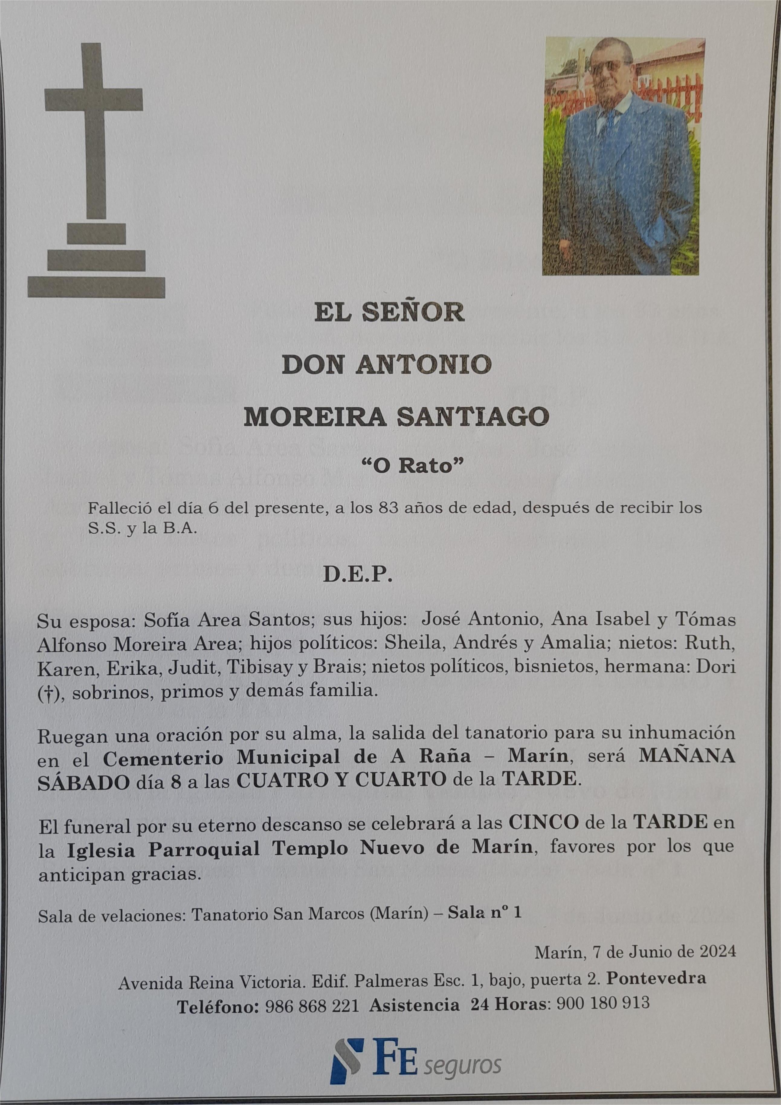 La funeraria LA FE comunica que, en la sala 1 del tanatorio San Marcos, en Marín, se velan los restos mortales de Don Antonio Moreira Santiago, fallecido ayer día 6, hasta el momento de su traslado para su inhumación en el Cementerio Municipal de A Raña, mañana sábado día 8 a las cuatro y cuarto de la tarde.