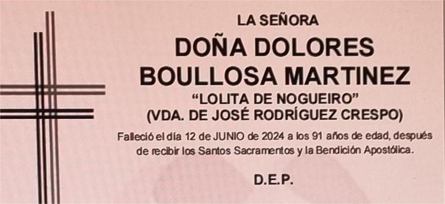 La funeraria ALBIA comunica que, en la sala 3 del tanatorio en Marín, se velan los restos mortales de Doña Dolores Boullosa Martínez “Lolita de Nogueiro”, fallecida hoy miércoles día 12, hasta el momento de su traslado para su inhumación en el Cementerio Municipal de Campo, mañana jueves día 13 a las cinco y media de la tarde.