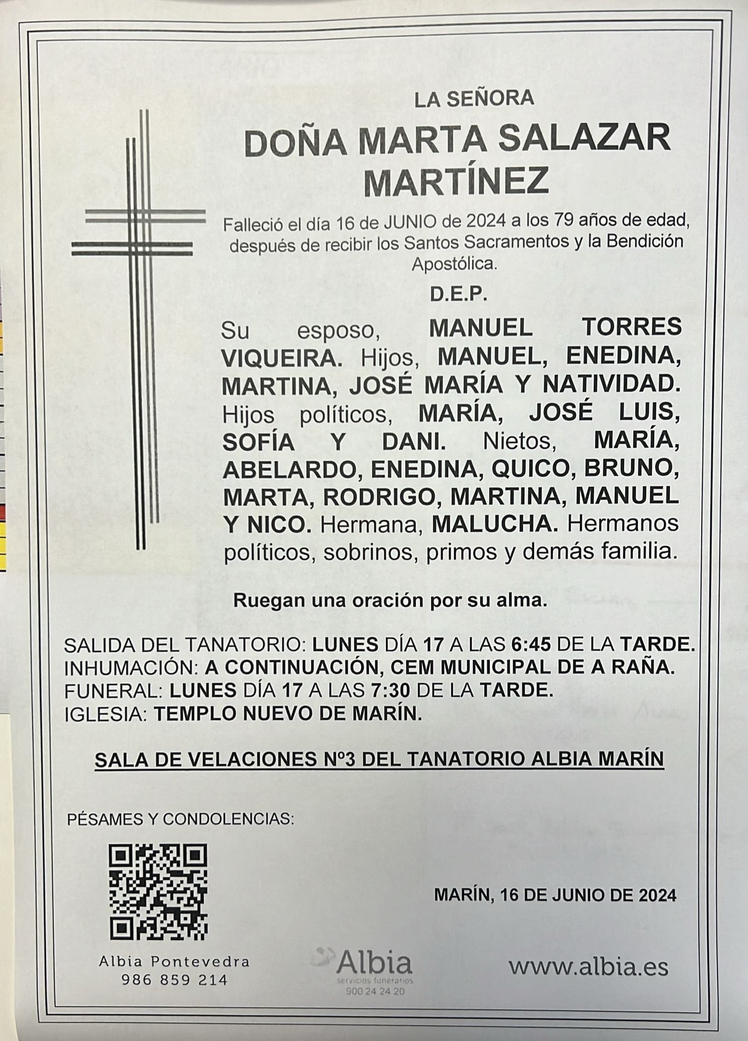 Mañana lunes los restos mortales de Marta Salazar saldrán del Tanatorio Albia de Marín al cementerio de A Raña y a las siete y media será la misa por su alma en el Nuevo Templo parroquial.