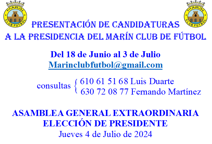 Según informan desde el grupo gestor, “La presentación de candidaturas se hará a través del correo electrónico del club: marinclubfutbol@gmail.com y, para cualquier duda o aclaración podrán dirigirse a los componentes de la Junta Gestora Luis Duarte 610 61 51 68 o Fernando Martínez 630 72 08 77, teniendo en cuenta que la Asamblea General Extraordinaria para la Elección de Presidente si hubiese candidaturas y su proclamación si procede queda convocada para el jueves 4 de Julio de 2024”.