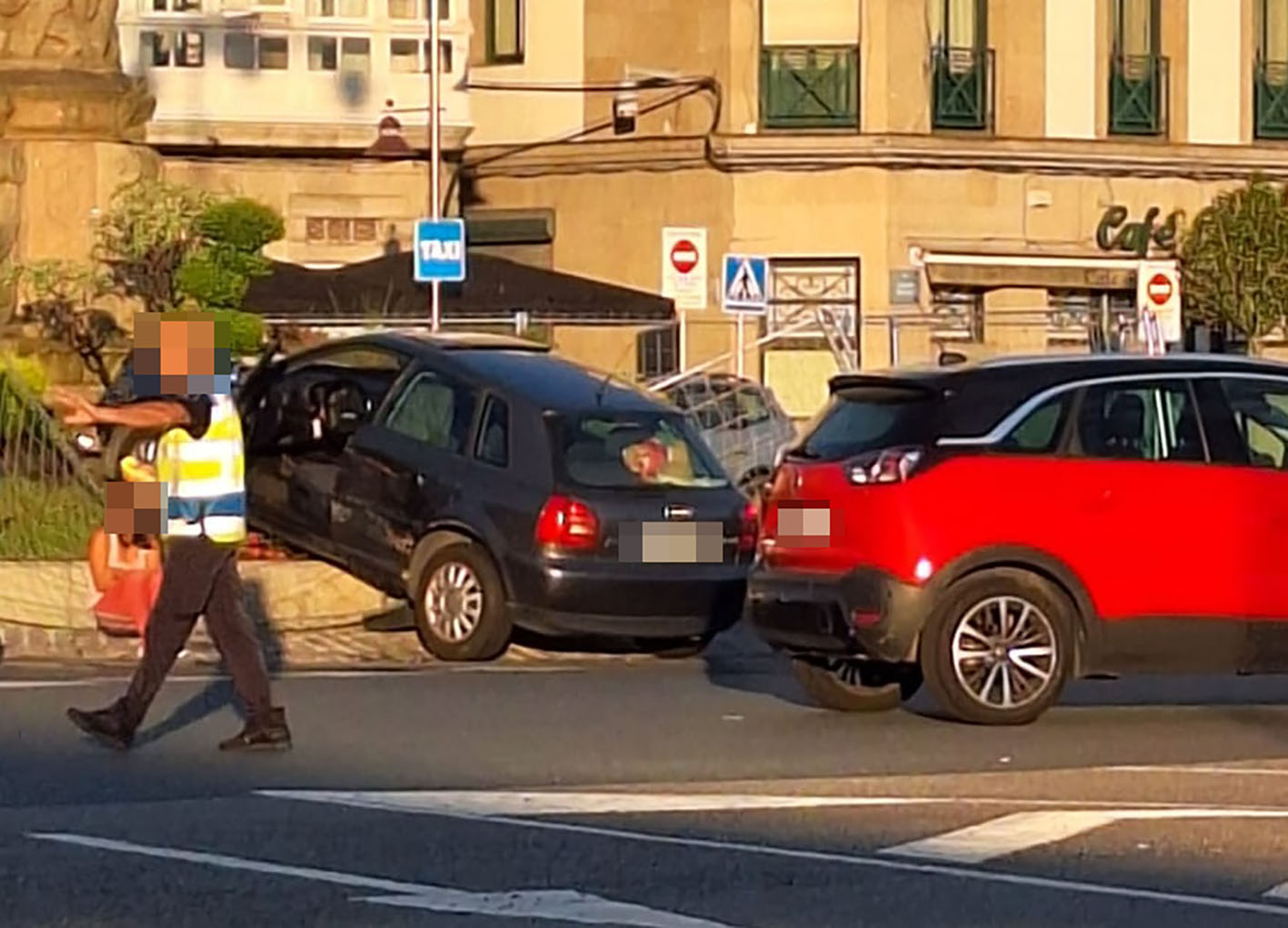 Una conductora perdió el control de su vehículo a primera hora de esta mañana en la plaza de España después de un pequeño choque con otro vehículo y fue a impactar contra unas vallas instaladas por operarios municipales que rodean la Farola para protegerla durante las fiestas. No hay que lamentar heridos, solamente algunos daños en el propio vehículo y en alguno de los paneles de protección, que hizo de rampa y provocó que el coche acabase encima de los parterres al pie de la Farola.