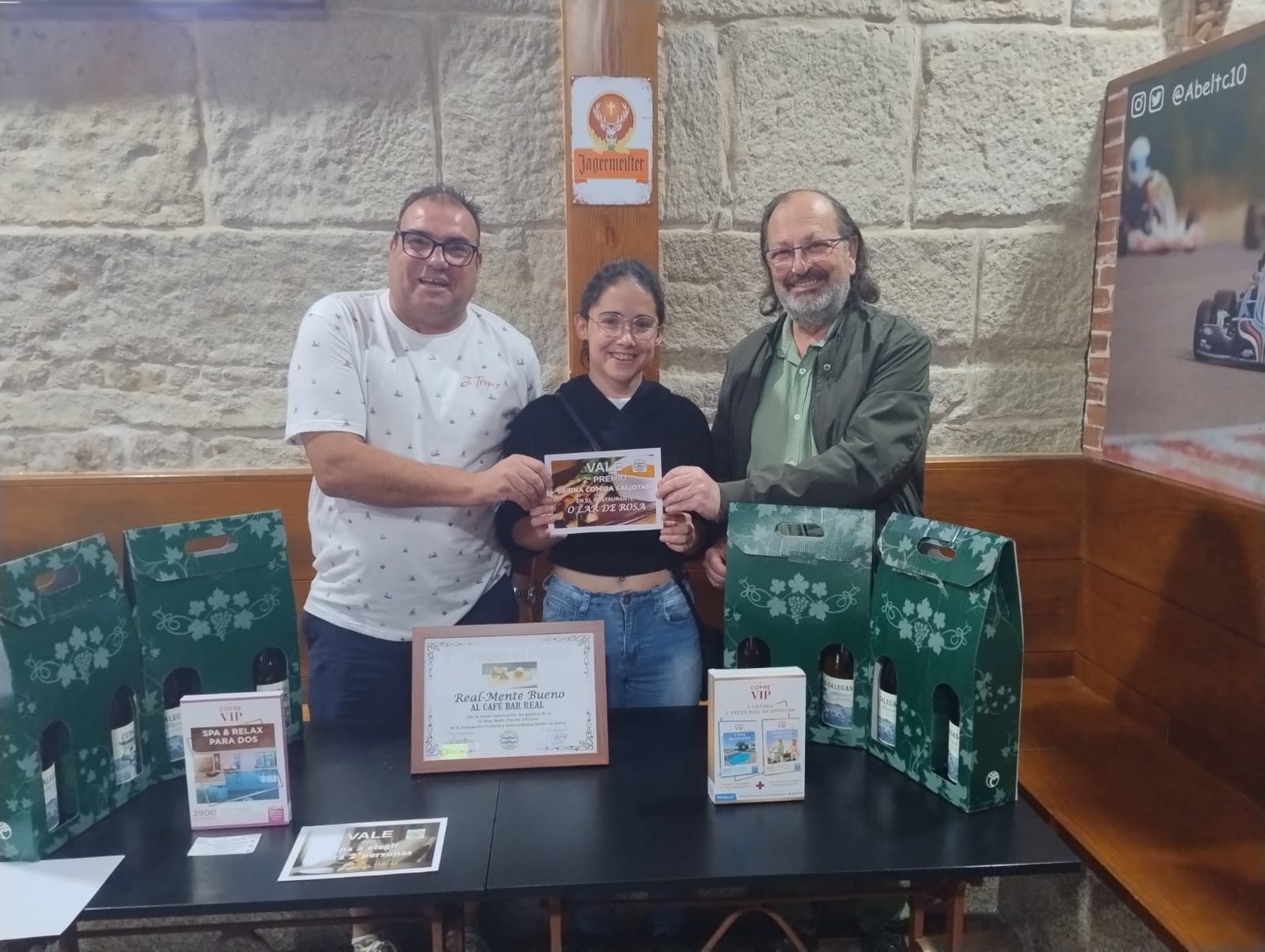 En cuanto a los regalos a los clientes que se eligieron a través de un sorteo con las tarjetas sellas por estos tras sus consumiciones. Fueron Sergio Pesqueira, que resultó agraciado con una estancia para dos personas en un spa, también a elegir entre varios opciones, e