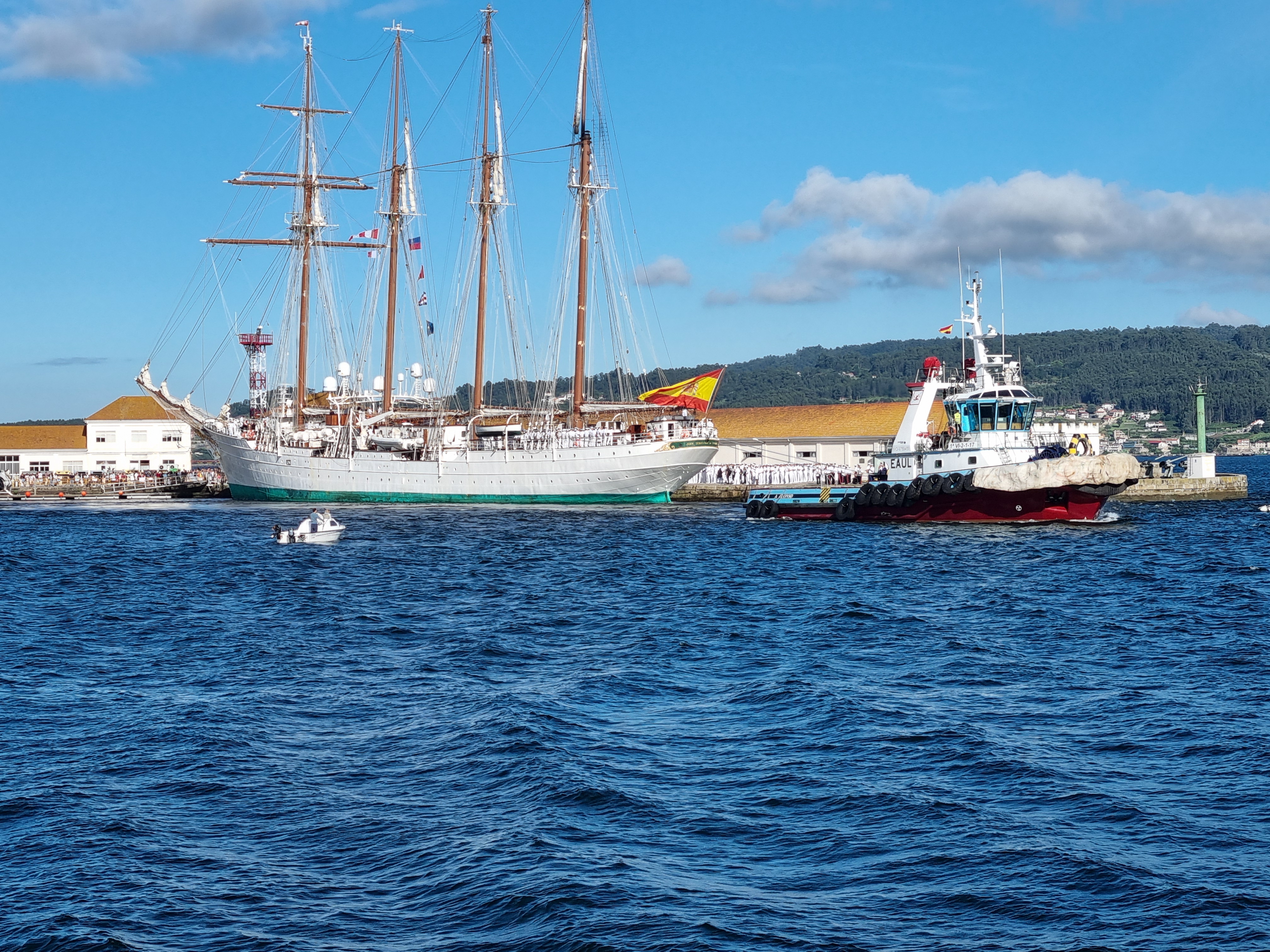 El buque escuele permanecerá ahora en Marín hasta el próximo miércoles. día 17, tras estar presente en el acto de Jura de Bandera de los aspirantes y Entrega de Reales Despachos a los nuevos oficiales que tendrá lugar el día 16, festividad del Carmen, Patrona de la Armada, acto que estará presidido por el Rey Felipe VI al que acompañarán miembros de la familia real como su hija, Leonor que el próximo año entrará como alumna en la Escuela Naval y realizará también el crucero por el mundo para culminar la segunda parte de su preparación militar iniciada este año en el Ejército de Tierra y que tendrá una tercera parte en la academia de Aviación en San Javier.