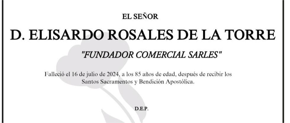La funeraria SAN MARCOS comunica que, en la sala 1 de su tanatorio en Marín, se velan los restos mortales de DON ELISARDO ROSALES DE LA TORRE, fallecido HOY día 16, hasta el momento de su traslado para su inhumación en el cementerio municipal de A RAÑA mañana miércoles día 17 a las seis menos cuarto de la tarde.