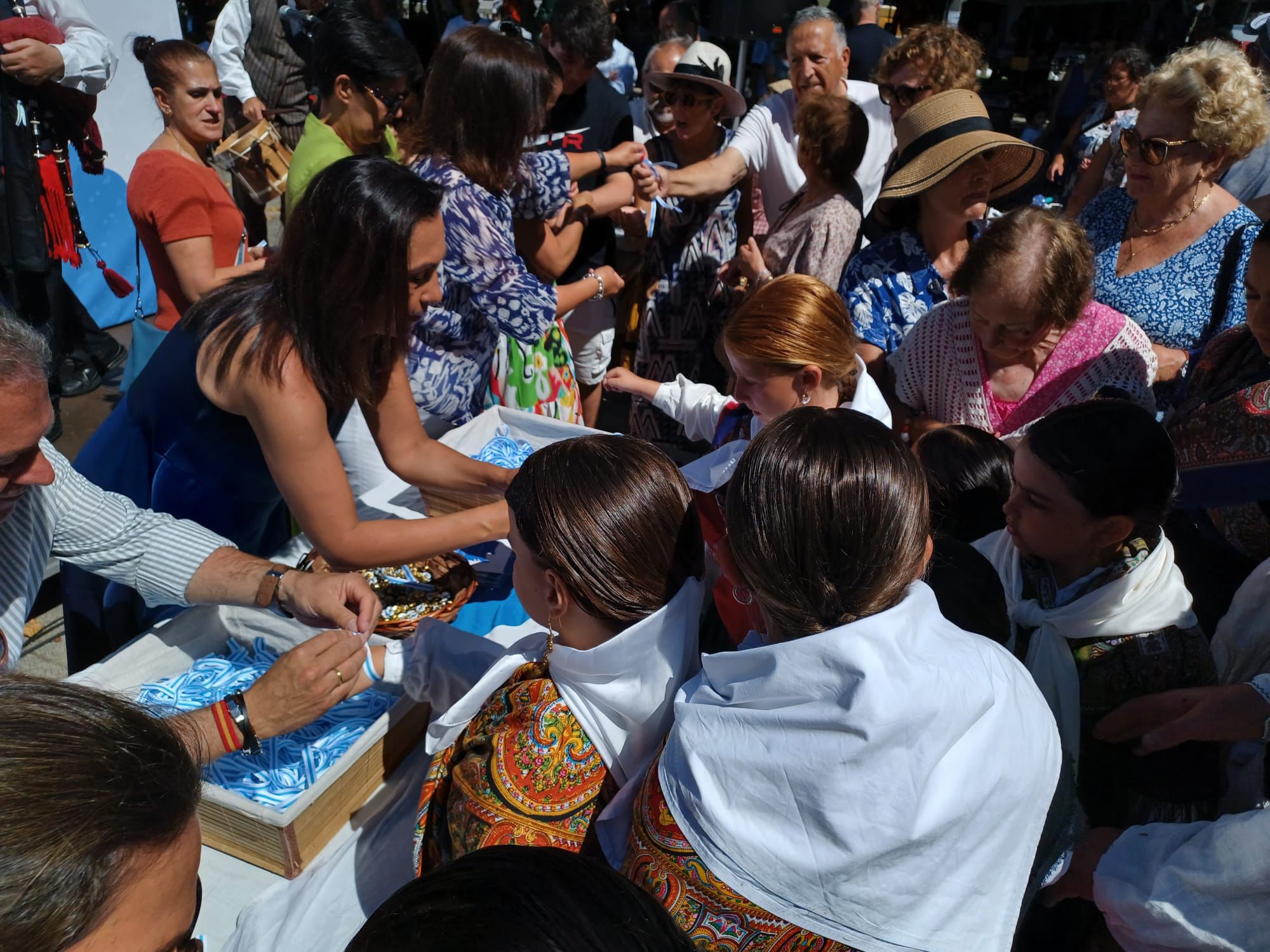 Durante la celebración matinal y tras la intervención de María Ramallo, se procedió a la entrega de pulseras con los colores de Galicia y el texto completo del Himno Galego en tarjetones que fueron repartidos entre las personas asistentes muchas de las cuales cantaron la letra al son de las gaitas del grupo Trompos ós Pes.