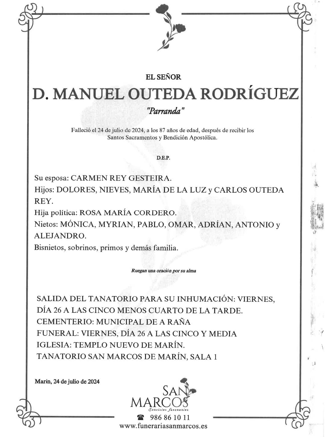 La funeraria SAN MARCOS comunica que, en la sala 1 de su tanatorio en Marín, se velan los restos mortales de DON MANUEL OUTEDA RODRÍGUEZ, fallecido el pasado día 24, hasta el momento de su traslado para su inhumación en el cementerio municipal de A RAÑA hoy viernes, día 26, a las cinco menos cuarto de la tarde.