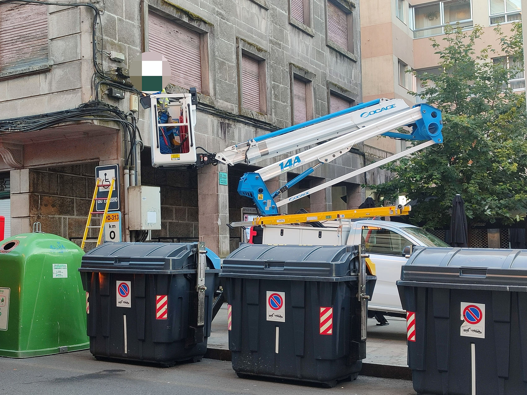A las ocho y media de la tarde llegó a la zona un gran generador de corriente que la empresa ha instalado en el primer tramo de Jaime Janer para dar servicio a los abonados de esta zona de la calle a los que no se le puede dar servicio mediante bypass; el artilugio funciona de manera ininterrumpida desde las nueve y media de la noche, y se espera que esté en funcionamiento hasta que se recupere totalmente el servicio.