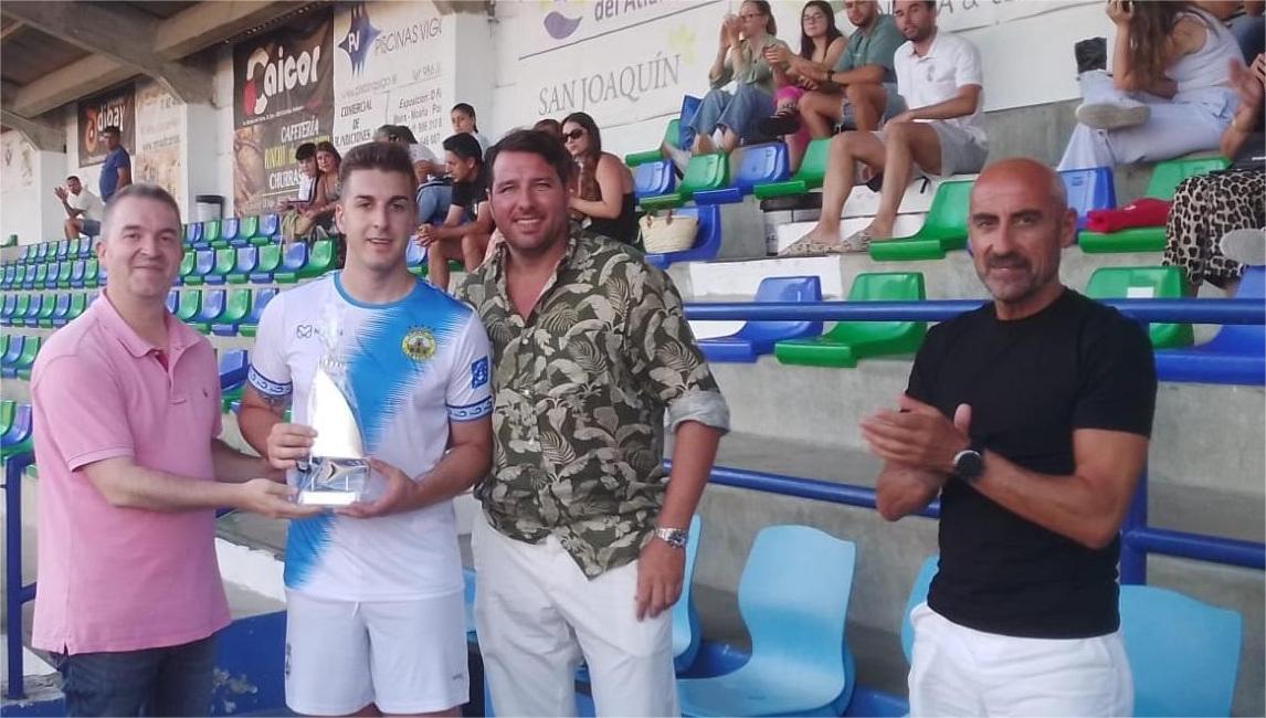 El capitàn del Céltiga recoge el trofeo de manos del concejal Traba y el pesidente del Marín