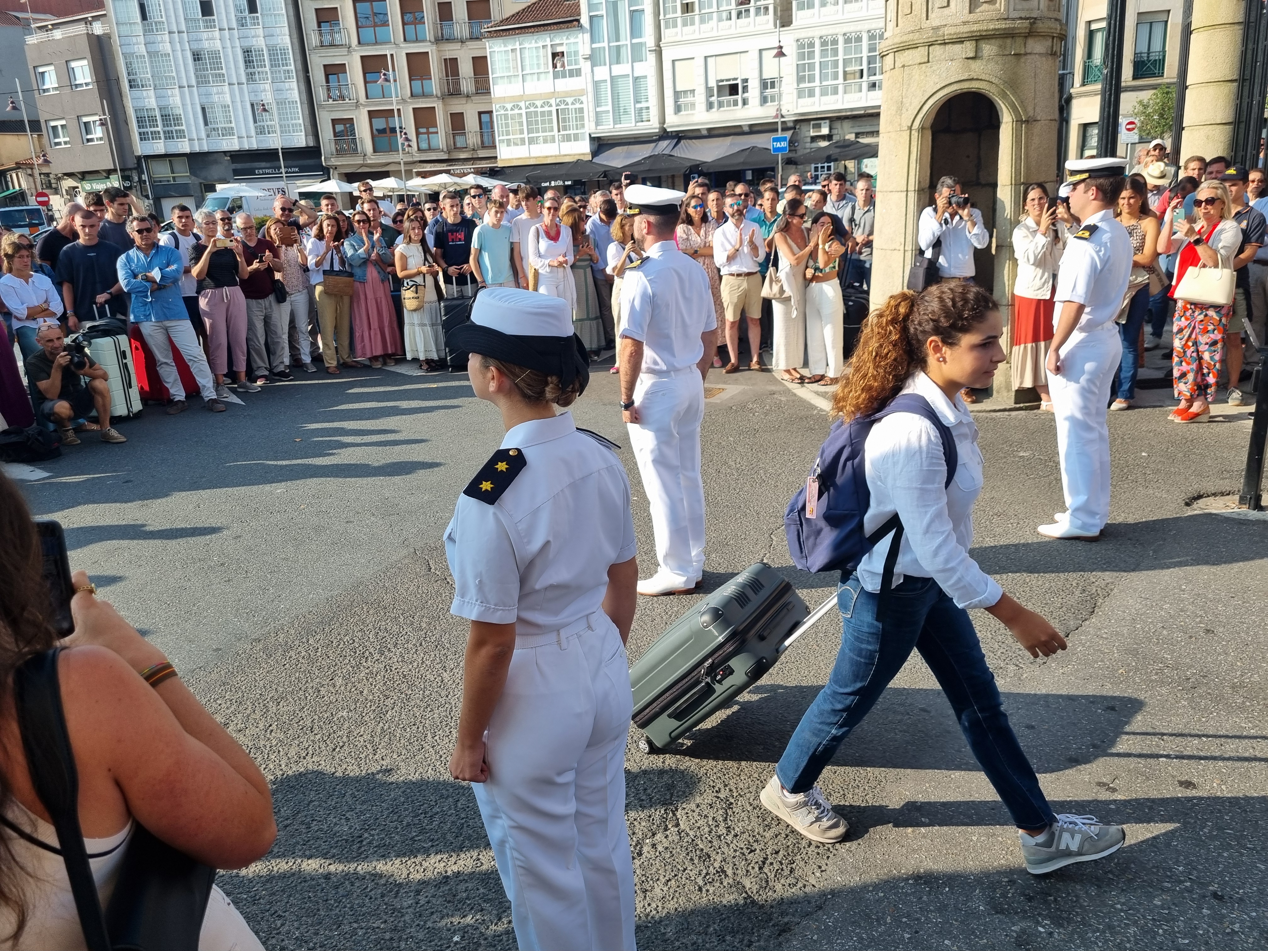 Desde una hora antes de la que figuraba en la convocatoria oficial se fueron concentrando en la Plaza de España, frente a la Puerta de Carlos I de la Escuela Naval Militar, los nuevos aspirantes a lo que acompañaban sus familiares, todos ellos tomados de los nervios por el paso que los y las jóvenes que se incorporan al centro, dan hoy a sus vidas.