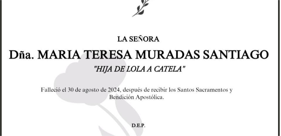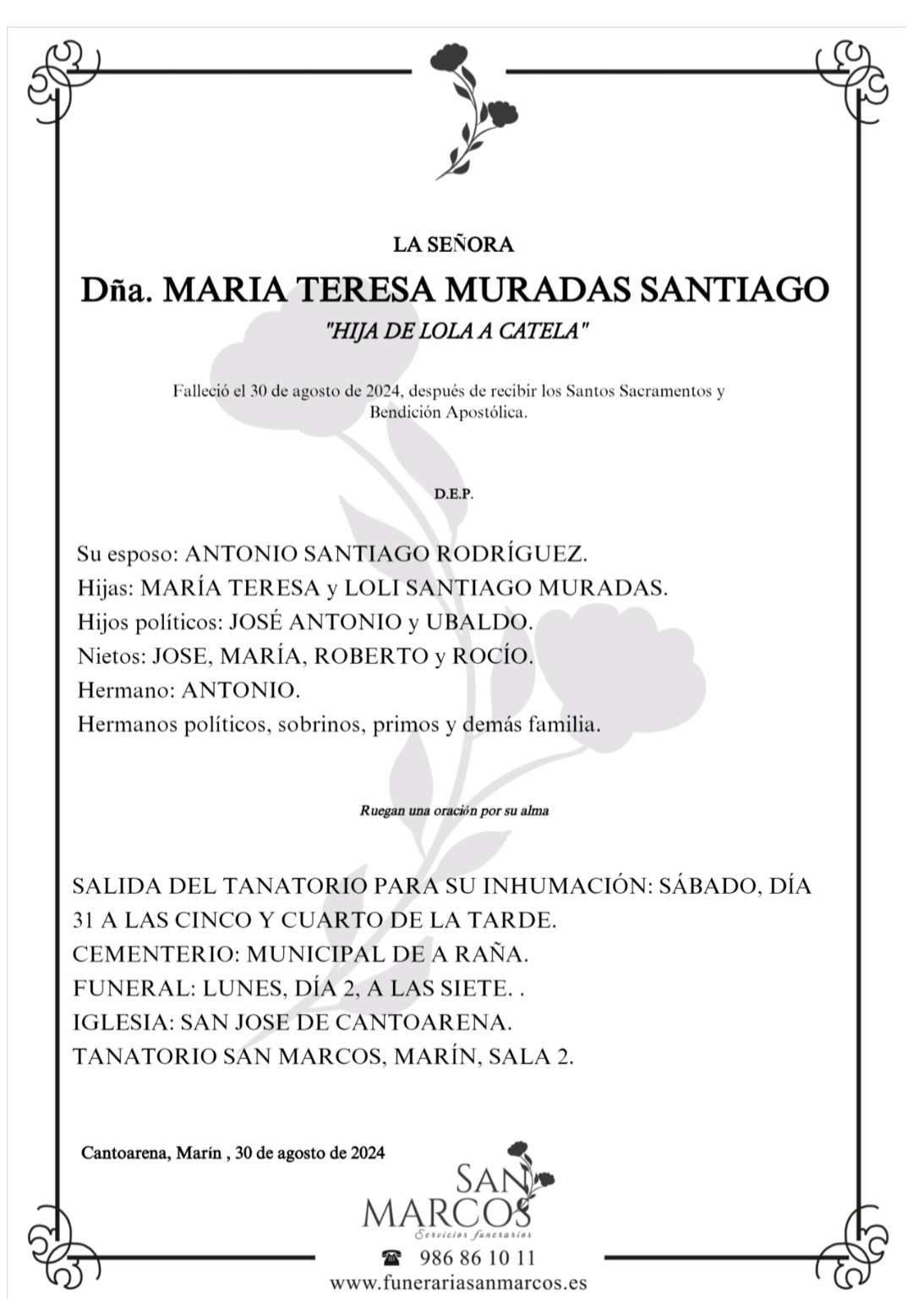 La funeraria SAN MARCOS comunica que, en la sala número 2 de su tanatorio en Marín, se velan los restos mortales de Doña Teresa Muradas Santiago, fallecida hoy día 30, hasta el momento de su traslado para su inhumación en el Cementerio Municipal de A Raña, en Marín, mañana sábado día 31 a las cinco y cuarto de la tarde.