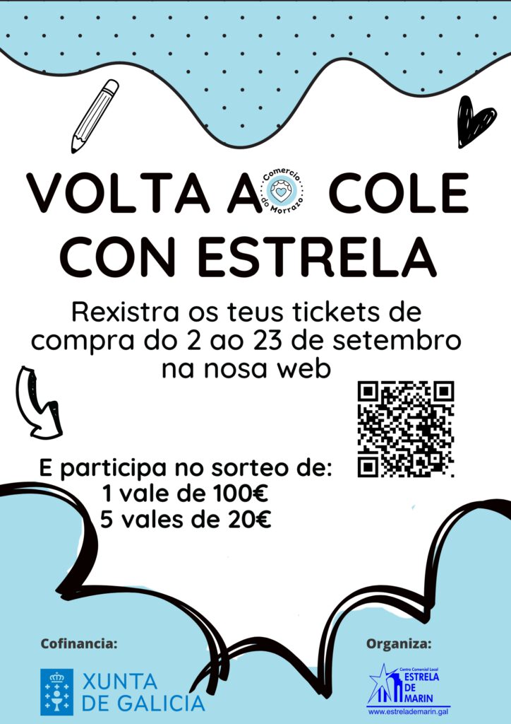 La asociación comercial marinense “Estrela de Marín” anuncia la puesta en marcha de una nueva campaña promocional denominada “A Volta ao Cole”. abierta ayer y hasta el día 23 de este mes de septiembre, con la que pretende premiar la fidelidad de los clientes al comercio local transmitiéndoles un atractivo que incentive la realización de compras relacionadas con el motivo de la campaña, con lo que pueden optar a premios por el sorteo de tarjetas compra de 100 y de 20 euros euros respectivamente para lo cual los clientes deberán registrar sus tickets de compra en el formulario habilitado para tal fin en https://www.estrelademarin.gal/volta-ao-cole-estrela-24/