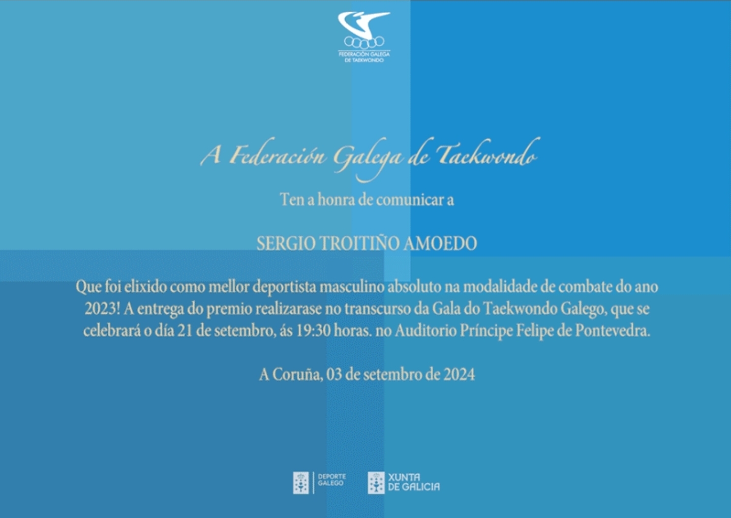 Y para comenzar, la Federación Gallega de Taekwondo acaba de informarle que ha sido designado como “Mejor deportista masculino de combate”, meritorio título que le será entregado el próximo día 21 de este mes en la gala que se celebrará el próximo día 21 en el auditorio del Príncipe Felipe, dándose la circunstancia de que, como ha sucedido en otras ocasiones, el joven deportista no podrá recoger su premio personalmente y lo harán su padre Jaime Troitiño y su abuelo José Amoedo porque Sergio viaja a Polonia en esa fecha con la Selección Española para participar en una competición internacional e incluso, una semana antes de este viaje, deberá competir en el Campeonato de España Sub 21.