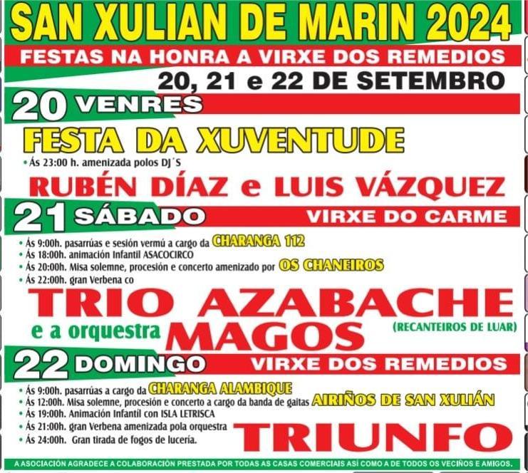 El grupo organizador desea, finalmente, agradecer de forma pública “La colaboración prestada por todos los vecinos, amigos, Comunidad de Montes de San Xulián, Concello de Marín y Diputación de Pontevedra para que las fiestas patronales de la parroquia de septiembre se puedan llevar a cabo”.