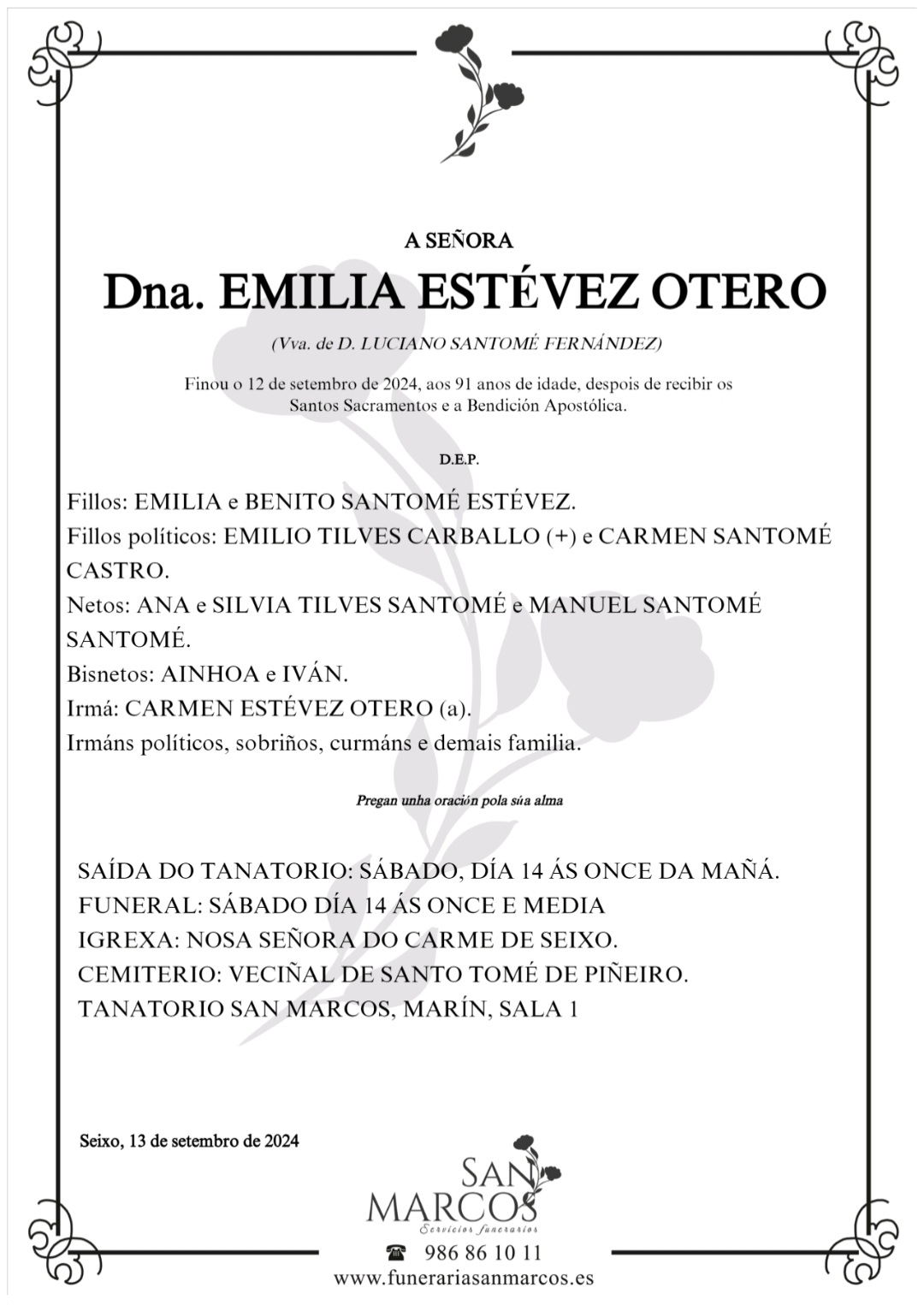 La funeraria SAN MARCOS comunica que, en la sala número 1 de su tanatorio en Marín, se velan los restos mortales de Doña Emilia Estévez Otero, fallecida ayer jueves día 12, hasta el momento de su traslado para su inhumación en el Cementerio Vecinal de Santo Tomé de Piñeiro, mañana sábado, día 14, a las once de la mañana.