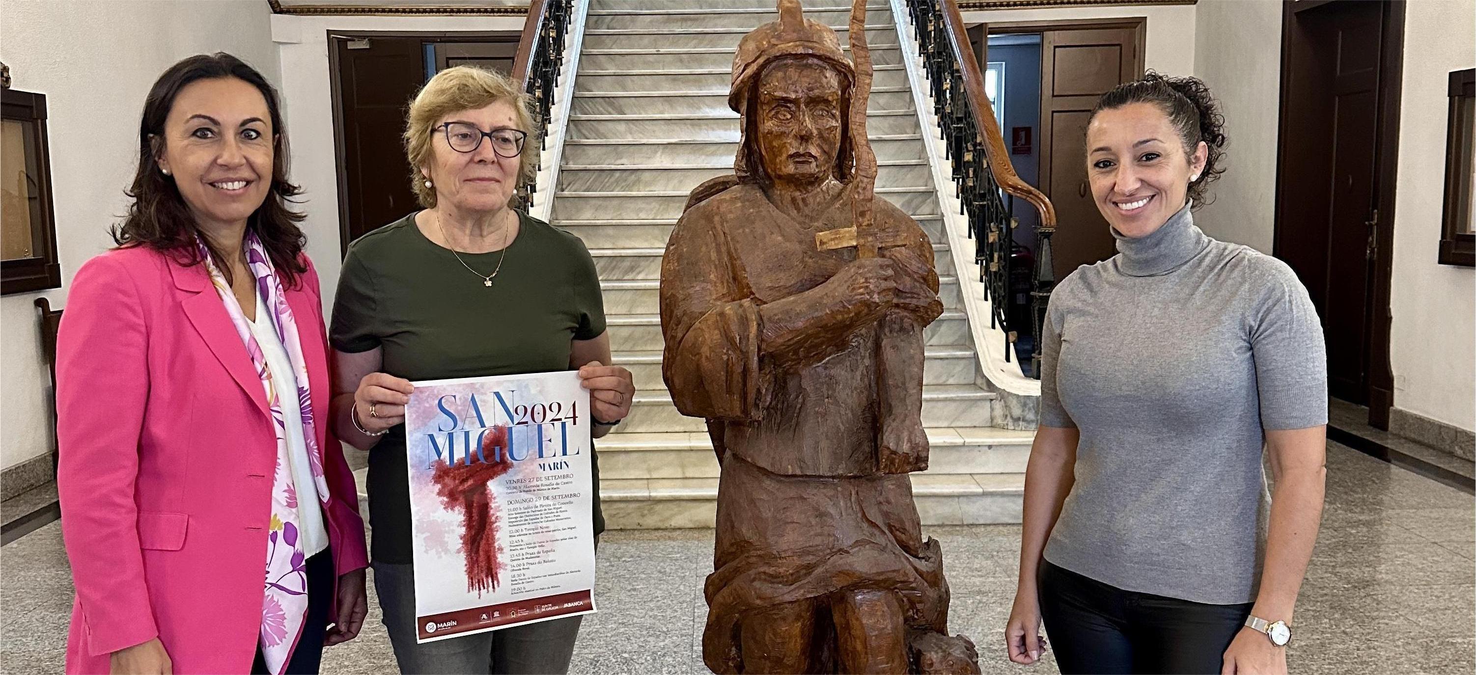 La alcaldesa María Ramallo y su concejala de fiestas Marián Sanmartín, junto con la vicepresidenta del Ateneo, Isabel Martínez Epifanio, hicieron ayer la presentación oficial del programa en la casa consistorial junto a la magnífica talla del Arcángel obra del escultor Marcos Mariño y con otros motivos propios de la celebración, anuniciando el programa general de los actos que se inician hoy con el concierto de la banda rock “Blue Merrow” en la alameda a las nueve y media de la noche que estará precedido por la actuación de la Banda de Música de Marín que comenzará a las siete y media de la tarde en la propia Alameda Rosalía de Castro.