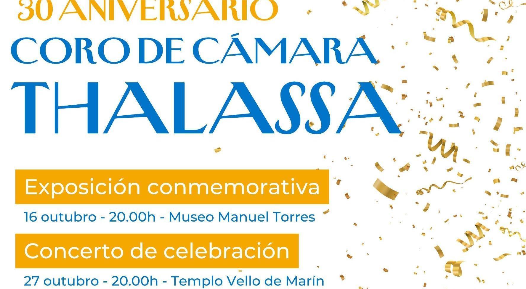 Nacieron como agrupación en 1994 sin sospechar, posiblemente, que treinta años después, seguirían en la brecha de este insuperable arte cultural de la canción de cámara que todos sus componentes viven apasionadamente. Numerosos conciertos en Marín, por supuesto, pero también por toda Galicia, Portugal y otras comunidades españolas atestiguan el valor de esta agrupación que, tal como ellos destacan en el anunico de este su treinta aniversario, “Para un coro como Thalassa, o feito de ser afeccionado leva aparellado un esforzo desinteresado, ofrecendo o froito dese traballo en cada actuación, mantendo ademáis o ánimo de lucro lonxe dos nosos intereses e, por todo elo, agradecemos o apoio das administracións públicas como a Deputación de Pontevedra e, especialmente o Concello de Marín ao longo destes anos”.