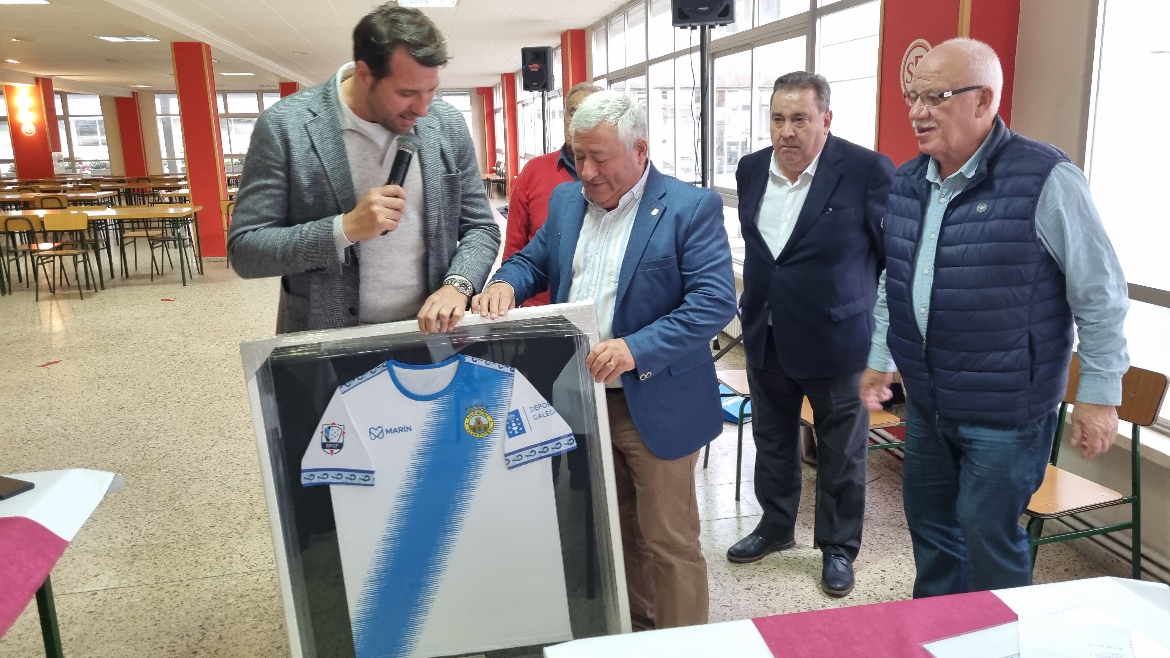 camiseta franjiazul del Marín enmarcada en un gran cuadro que el presidente del Marín C.F. Miguel Pazos Beis le hizo entrega tras pronunciar unas palabras de reconocimiento en nombre del Marín C.F. entidad que siempre encontró apoyo en Carlos Giráldez sobre todo en momentos difíciles de su larga historia.