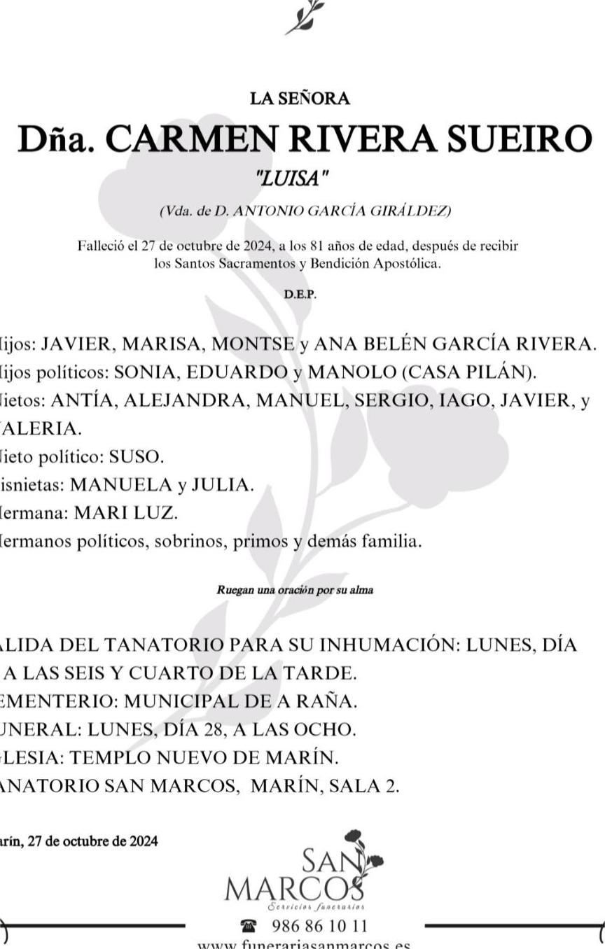 La funeraria San Marcos comunica el fallecimiento, hoy domingo día 27 de doña CARMEN RIVERA SUEIRO cuyos restos mortales se velan en la sala número 2 del Tanatorio San Marcos de Marín, hasta el momento de su salida, mañana LUNES día 28, a las SEIS Y CUARTO de la tarde para su inhumación en el cementerio municipal de A Raña..