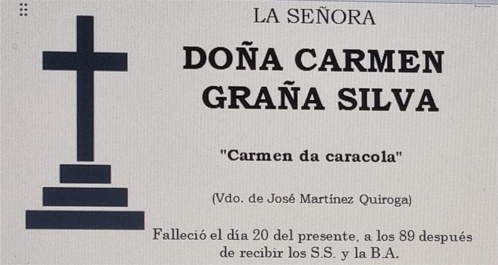La funeraria LA FE comunica el fallecimiento, hoy día 20 de Doña CARMEN GRAÑA SILVA, cuyos restos mortales se velan en el “Tanatorio San Marcos ”, en Marín, sala número 1, hasta el momento de su salida, mañana JUEVES día 21, a las ONCE Y CUARTO de la mañana a la Iglesia parroquial de Nuestra Señora del Carmen, en Seixo, y tras el funeral por su eterno descanso, al cementerio municipal de O Campo para su inhumación. D.E.P.