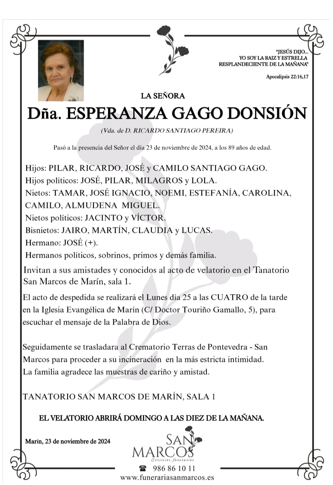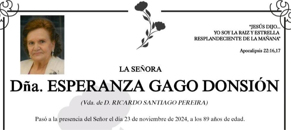 La funeraria SAN MARCOS comunica el fallecimiento, hoy día 23 de Doña ESPERANZA GAGO DONSIÓN, cuyos restos mortales se velarán en su tanatorio de Marín sala número 1 que abrirá su acceso a las diez de la mañana de mañana domingo, día 24. a las diez de la mañana, hasta el momento de su salida, el próximo lunes, día 25 a las CUATRO de la tarde, a la Iglesia Evangélica de Marín para escuchar el mensaje de la Palabra de Dios