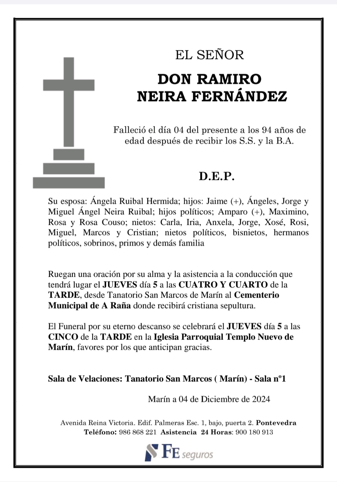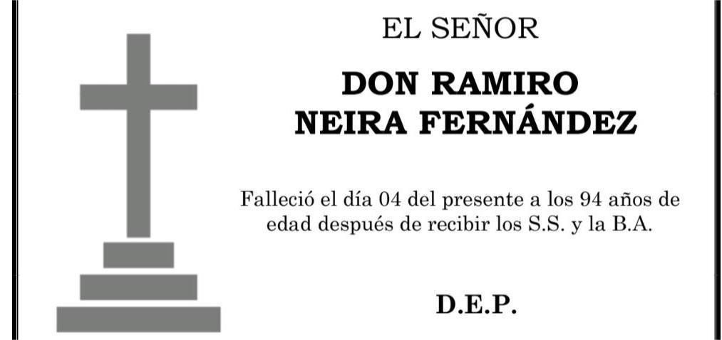 La funeraria LA FE comunica el fallecimiento, hoy día 4 de Don RAMIRO NEIRA FERNÁNDEZ, cuyos restos mortales se velan en tanatorio San Marcos de Marín, sala número 1, hasta el momento de su traslado, mañana jueves, día 5 a las CUATRO Y CUARTO de la tarde, al cementerio municipal de A Raña para su inhumación.