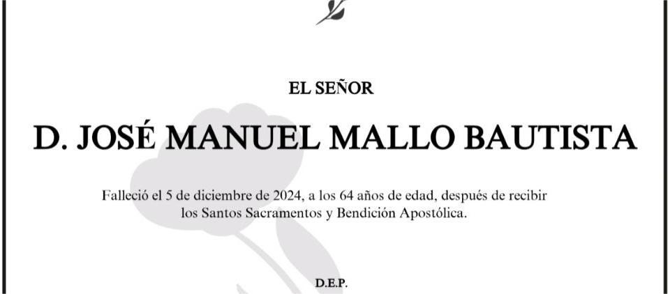 La funeraria SAN MARCOS comunica el fallecimiento, hoy día 5 de Don JOSÉ MANUEL MALLO BAUTISTA, cuyos restos mortales se velan en tanatorio San Marcos de Marín, sala número 2, hasta el momento de su traslado, mañana viernes, día 6 a las DOCE Y CUARTO del mediodía, al cementerio municipal de A Raña para su inhumación.