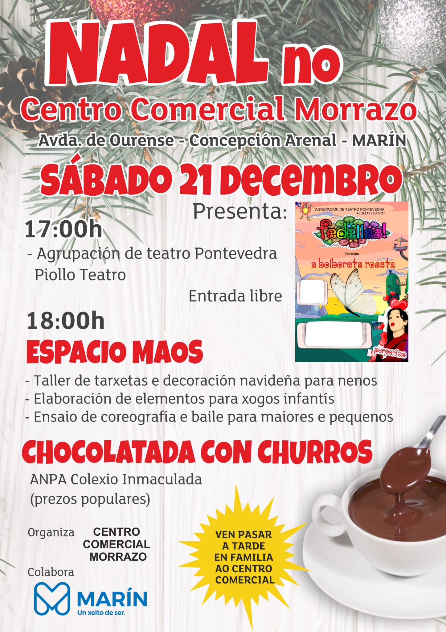 Se une al programa navideño el Centro Comercial Morrazo que también desarrolla, a partir de las cinco de la tarde, una gran fiesta infantil en la que no faltará la animación especializada a cargo de “A Bolboreta Rosa” de la agrupación de teatro “Fedellas”. Talleres de tarjetas, elaboración de juegos, ensayo de bailes y también una gran y asequible chocolatada con churros que organiza la ANPA del Colegio Inmaculada, completan el programa y la diversión de la tarde.