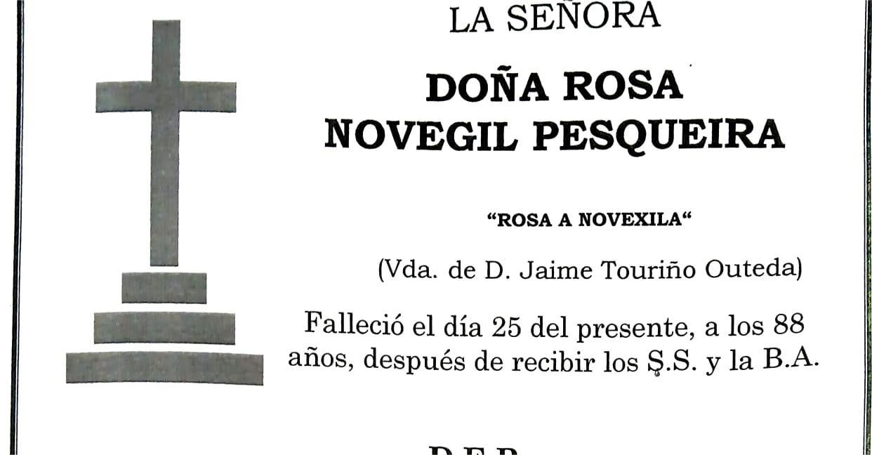 La funeraria LA FE comunica el fallecimiento, HOY día 25 de Doña ROSA NOVEGIL PESQUEIRA cuyos restos mortales permanecen en el Tanatorio San Marcos de Marín, sala número 1, de donde saldrán mañana jueves día 26 a las CINCO Y CUARTO de la tarde para su inhumación en el Cementerio Municipal de Mogor