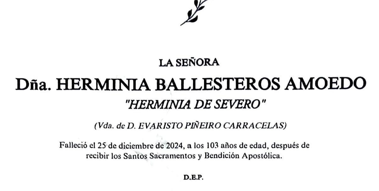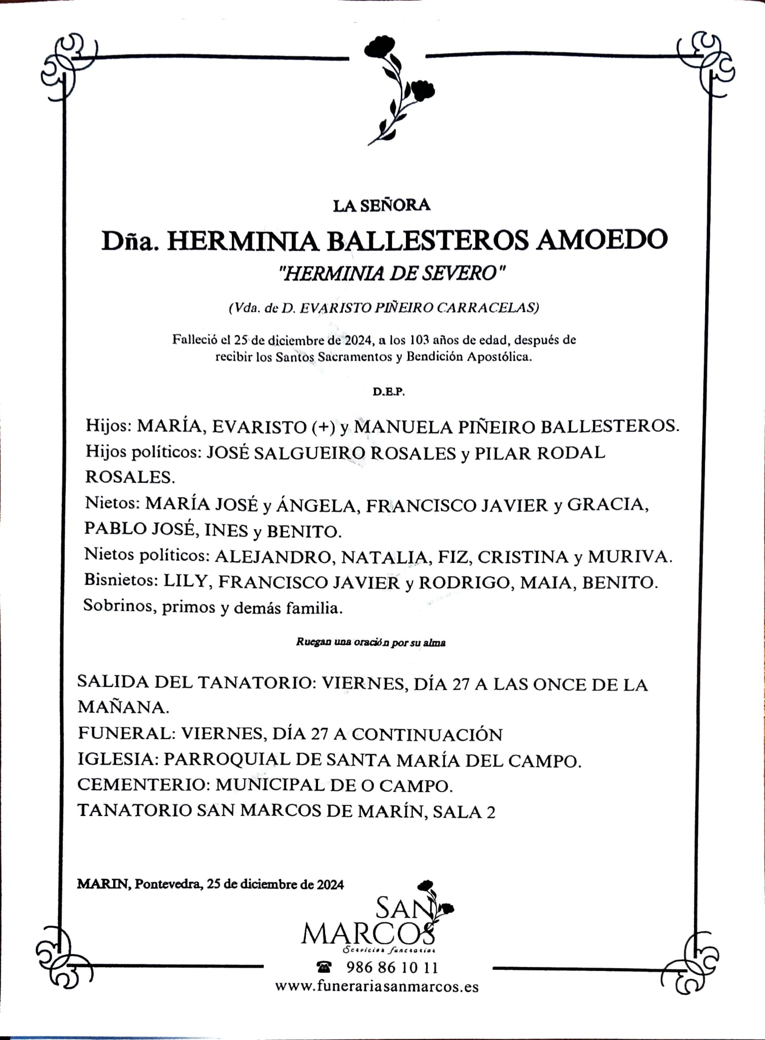 La funeraria SAN MARCOS comunica el fallecimiento, ayer día 25, de doña HERMINIA BALLESTEROS AMOEDO cuyos restos mortales permanecen en el Tanatorio San Marcos de Marín, sala número 2, de donde saldrán mañana viernes día 27 a las ONCE de la mañana.