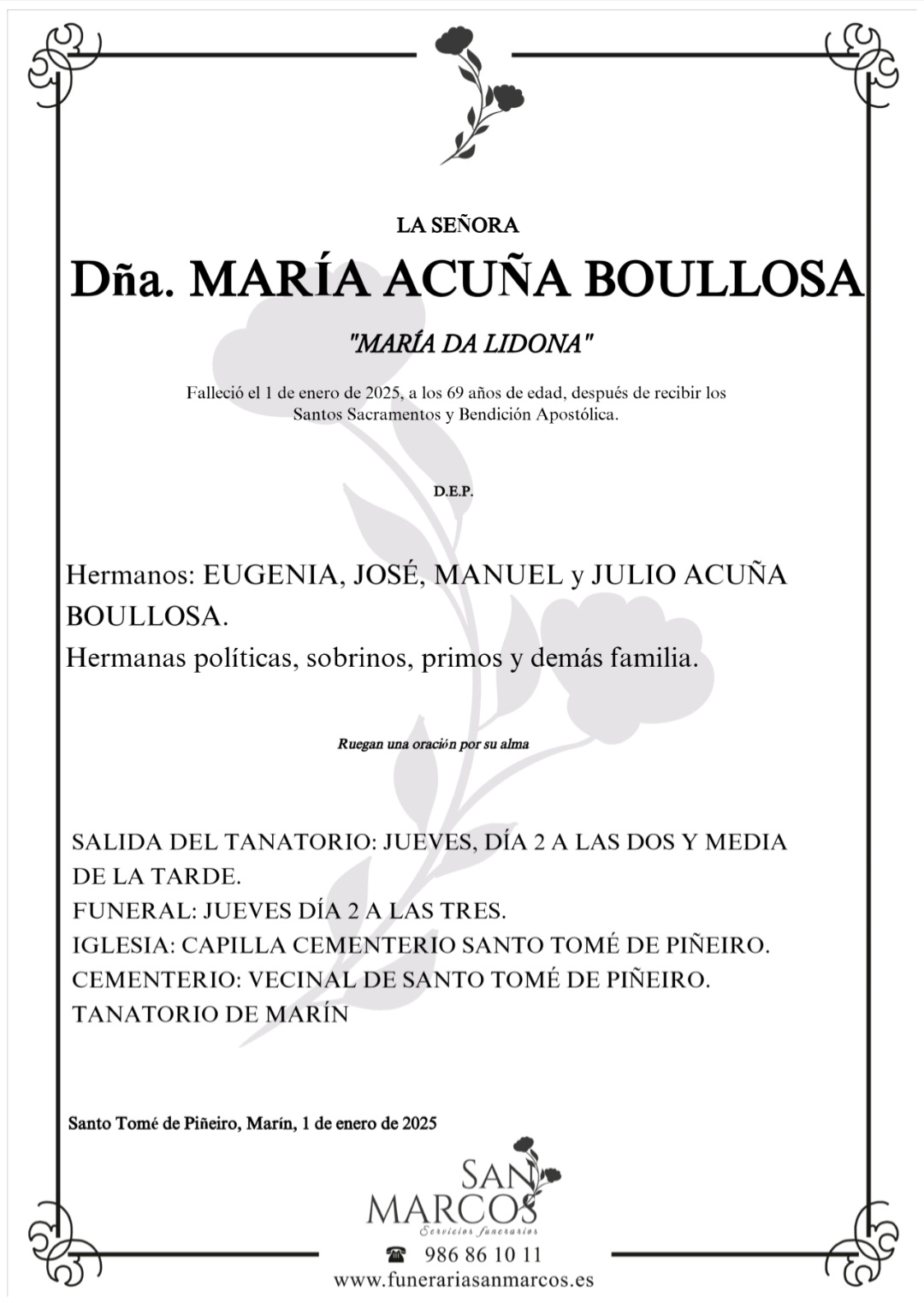La funeraria SAN MARCOS comunica el fallecimiento, ayer día 31, de doña MARÍA ACUÑA BOULLOSA cuyos restos mortales permanecen en el Tanatorio San Marcos de Marín, de donde saldrán mañana jueves día 2 a las dos y media de la tarde hacia el cementerio vecinal de Santo Tomé de Piñeiro donde recibirá cristiana sepultura y en cuya capilla tendrá lugar el funeral por su eterno descanso a las tres de la tarde. D.E.P.