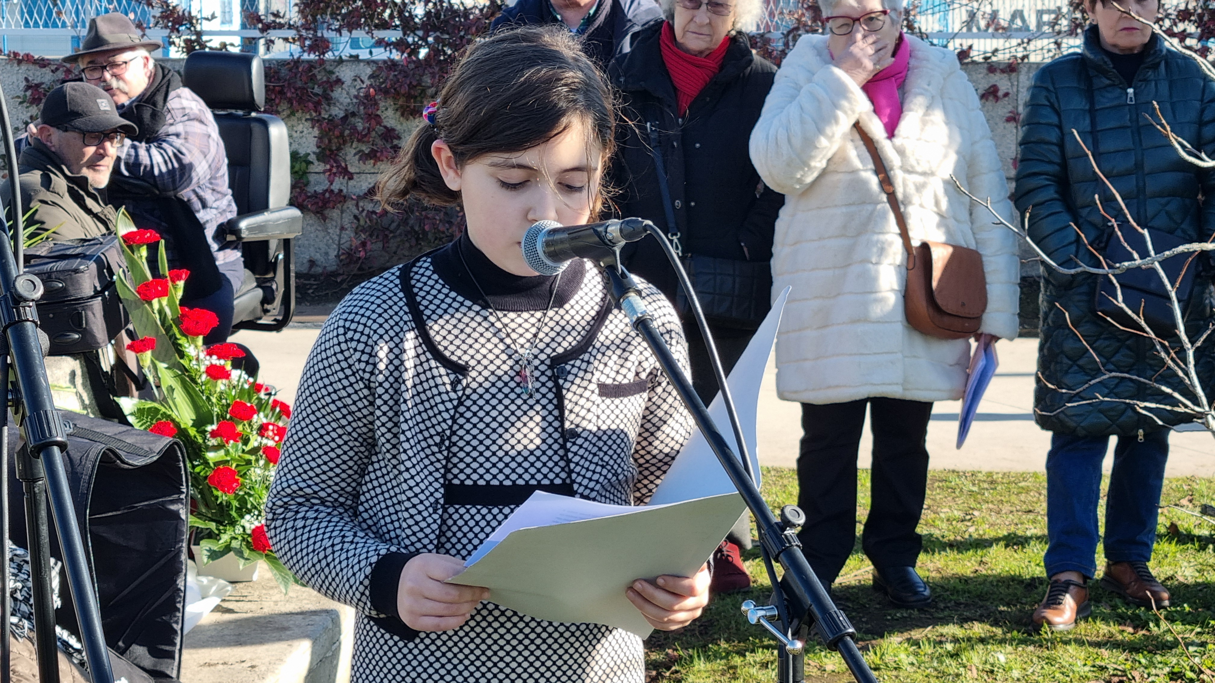 Finalmente en el turno de las intervenciones la niña Uxía Lubián Pardellas leyó el texto de un articulo que su abuelo, Julio Pardellas allí presente, escribió en prensa en ocasión del fallecimiento de su propio padre, docente que también fuera perseguido por su labor profesional.