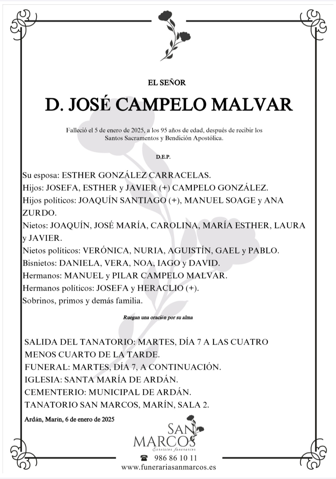 La funeraria SAN MARCOS comunica el fallecimiento, ayer día 5, de don JOSÉ CAMPELO MALVAR cuyos restos mortales permanecen en el Tanatorio San Marcos de Marín, sala número 2, de donde saldrán mañana martes día 7 a las cuatro menos cuarto de la tarde hacia el cementerio municipal de Ardán para su inhumación