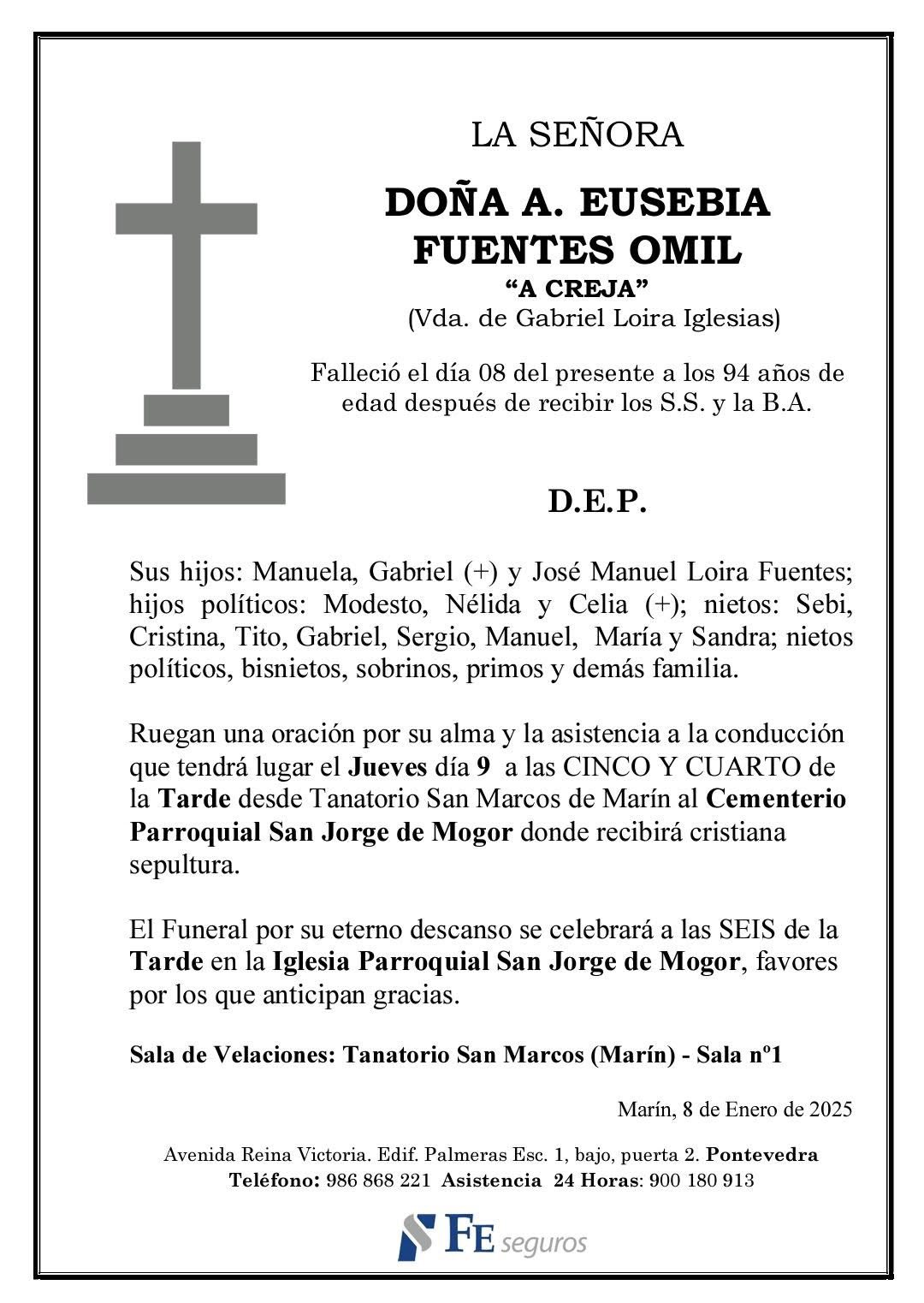 La familia comunica el fallecimiento, hoy día 8, de doña A.EUSEBIA FUENTES OMIL cuyos restos mortales permanecen en el Tanatorio San Marcos de Marín, sala número 1, de donde saldrán mañana JUEVES día 9 a las cinco y cuarto de la tarde hacia el cementerio parroquial de San Jorge de Mogor para su inhumación