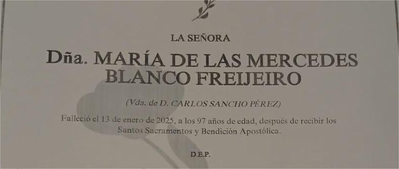 La familia de doña MARÍA DE LAS MERCEDES BLANCO FREIJEIRO comunica su fallecimiento en el día de hoy,13 de enero, cuyos restos mortales se velan en la sala número 1 del Tanatorio San Marcos de Marín, de donde se trasladarán el próximo miércoles día 15 a las cinco de la tarde al cementerio municipal de A Raña para su inhumación .