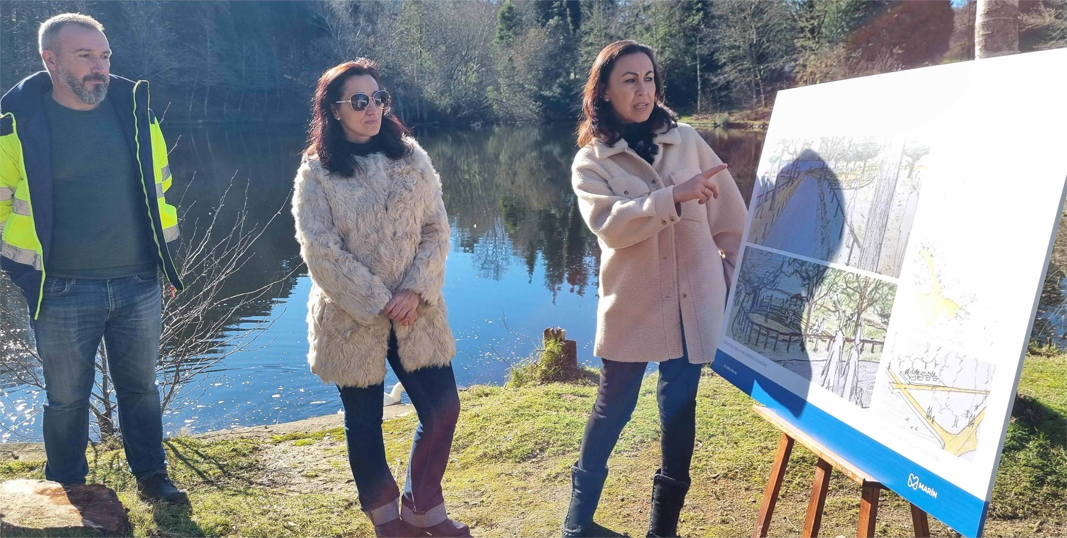 María Ramallo, alcaldesa de Marín junto con la concejala Marián Sanmartín y personal de la empresa “Caldevergazo” adjudicataria de la obra, asistieron ayer al inicio de los trabajos que aportarán al recinto un plus de sostenibilidad turística sin, prácticamente, alterar la sustancia del entorno pero reorganizando los espacios en los que conviven los tráficos peatonal y rodado, así como situar un recinto circular a modo de auditorio y una zona de aparcamiento muy próxima de vehículos, coches y autobuses, que libere de los mismos a la zona principal del propio lago y su zona de influencia.