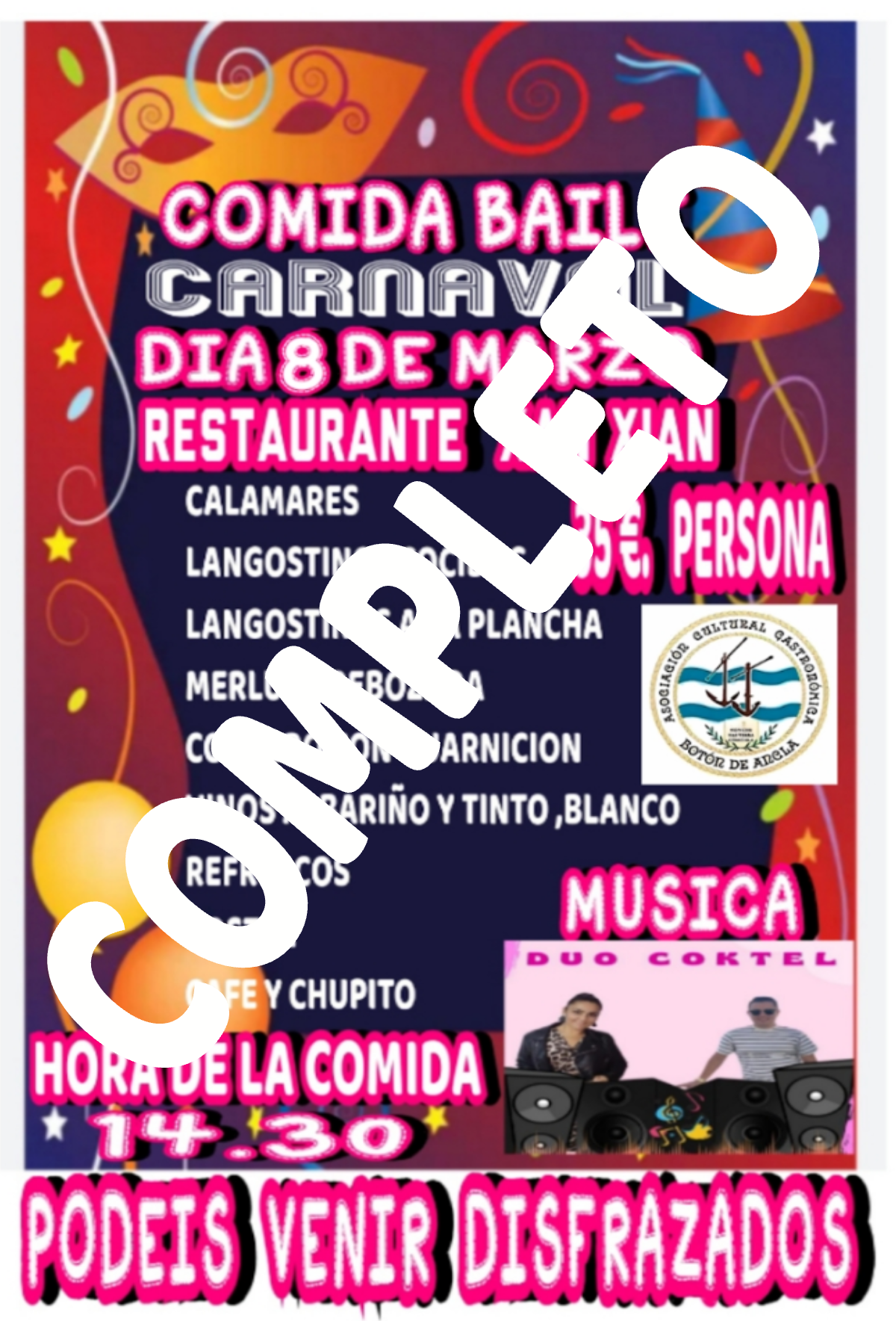 Desde “Botón de Ancla” se recomienda a los asistentes que participen de alguna manera disfrazados o “ambientados”, sin que ello sea imprescindible, para dar a la reunión gastronómica el aspecto de la fiesta que se celebra y cuya parte de baile correrá a cargo del “Dúo Cóktel”.