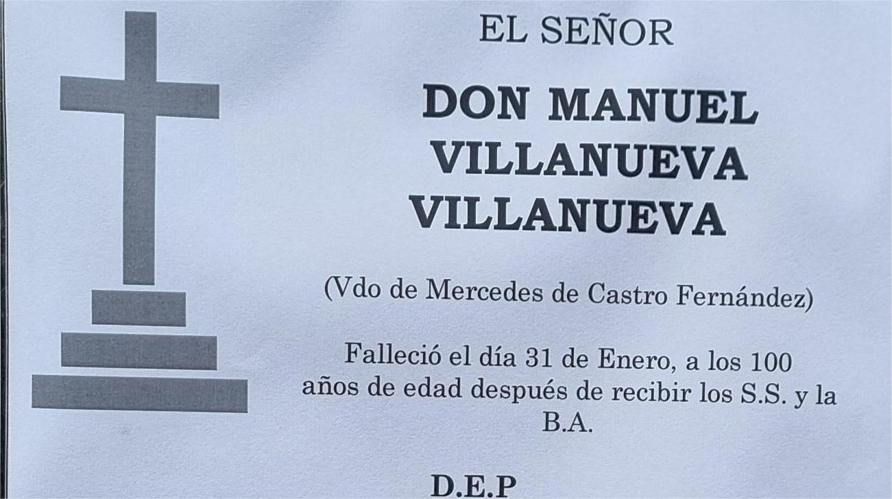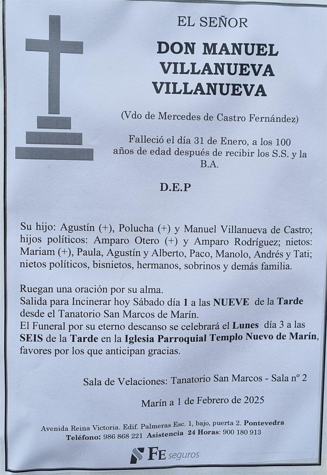 La funeraria LA FE comunica el fallecimiento el día 31 de enero, de D. MANUEL VILLANUEVA VILLANUEVA cuyos restos mortales permanecerán en el Tanatorio San Marcos de Marín, sala número 2 hasta el momento de su traslado, hoy sábado día 1, a las nueve de la tarde para su incineración en la intimidad familiar
