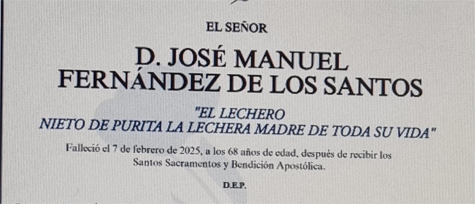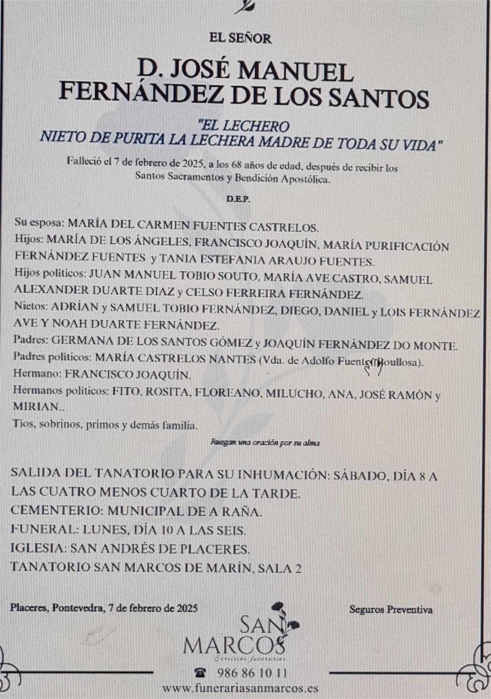 La funeraria SAN MARCOS comunica el fallecimiento ayer día 7 de febrero, de Don JOSÉ MANUEL FERNÁNDEZ DE LOS SANTOS cuyos restos mortales permanecerán en el Tanatorio San Marcos, de Marín, sala número 2, hasta el momento de su traslado, hoy sábado día 8, a las cuatro menos cuarto de la tarde para su inhumación en el Cementerio Municipal de A Raña